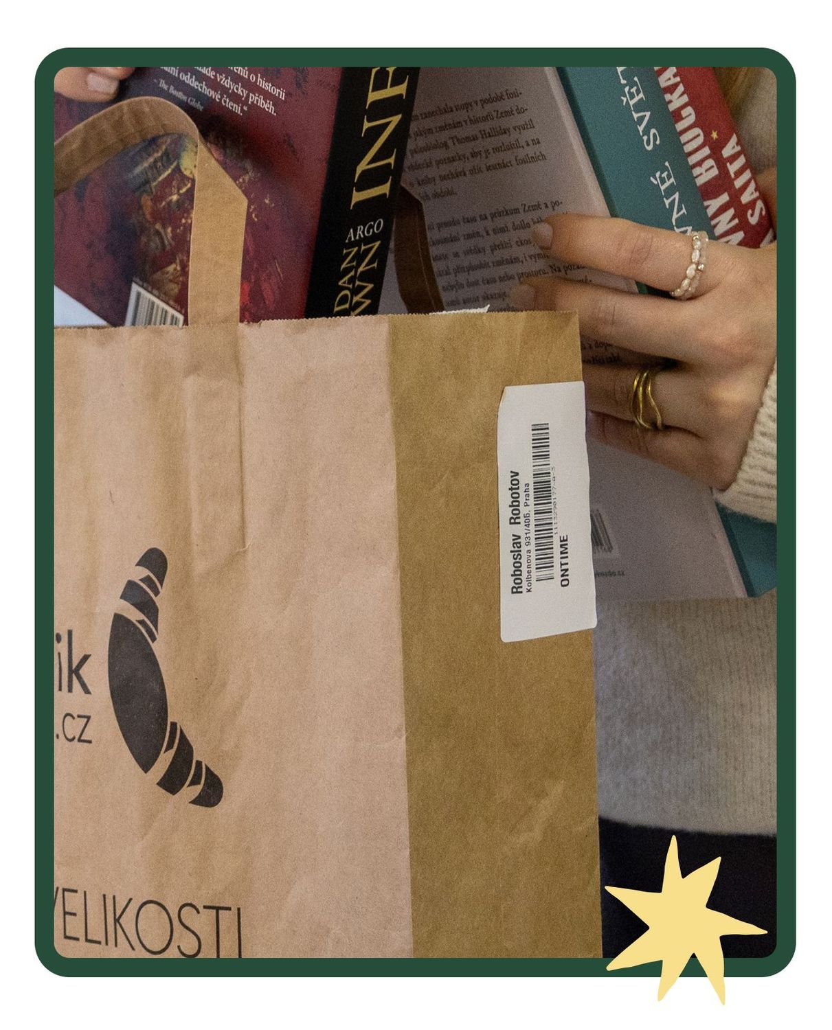 Připrav knihy do papírové tašky (pokud máš tu z Rohlíku, bude to nejjednodušší) nebo krabice. Důležité je, aby byla dobře uzavřená a zalepená, aby se knihy cestou nevysypaly.
