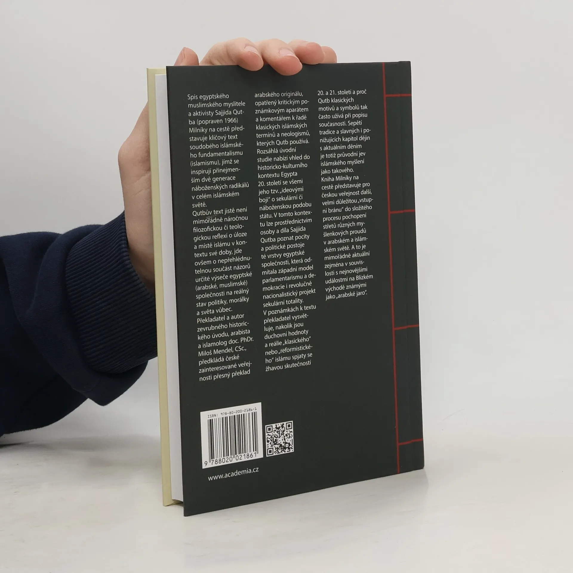 Spis egyptského muslimského myslitele a aktivisty, který byl popraven v roce 1966, představuje klíčový text soudobého islámského fundamentalismu, inspirující alespoň dvě generace náboženských radikálů po celém islámském světě. Překladatel a autor historického úvodu, český arabista a islamolog Miloš Mendel, nabízí české veřejnosti, intelektuálům, novinářům a studentům arabistiky, religionistiky a politologie přesný překlad textu, doplněný podrobným kritickým poznámkovým aparátem a komentářem k islámským termínům a neologismům, které autor používá. Mendelův úvod poskytuje vhled do historicko-kulturního kontextu Egypta 20. století a jeho ideových bojů o sekulární či náboženskou podobu státu. Vysvětluje pocity a politické postoje vrstvy egyptské společnosti, která odmítala západní model parlamentarismu a demokracie. Překlad je zamýšlen jako studijní text pro studenty arabistiky a islamologie a věrně sleduje arabský originál stylisticky. Tato práce představuje pro českou veřejnost důležitou „vstupní bránu“ k pochopení střetů různých myšlenkových proudů v arabském a islámském světě, což je obzvlášť aktuální v souvislosti s událostmi známými jako „Arabské jaro“.