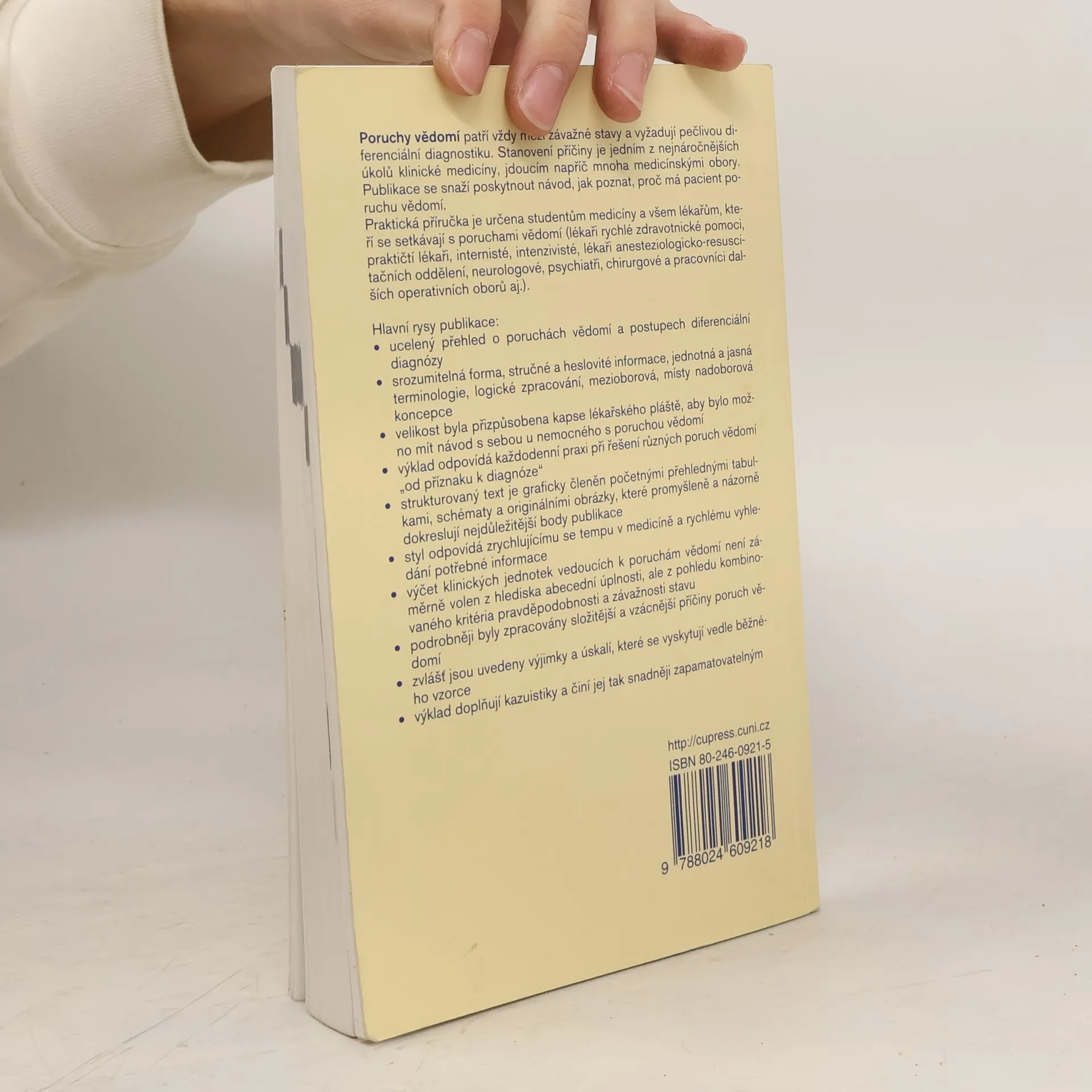 Poruchy vědomí jsou závažné stavy, které vyžadují pečlivou diferenciální diagnostiku. Stanovení příčiny je jedním z nejnáročnějších úkolů klinické medicíny a zahrnuje různé medicínské obory. Publikace nabízí návod, jak zjistit příčinu poruchy vědomí u pacienta. Je určena studentům medicíny a lékařům, kteří se s těmito poruchami setkávají, včetně lékařů rychlé zdravotnické pomoci, internistů, neurologů a dalších specialistů. Hlavní rysy zahrnují ucelený přehled o poruchách vědomí a diferenciální diagnostice, srozumitelnou formu a jasnou terminologii. Velikost publikace je přizpůsobena kapse lékařského pláště pro snadné nošení. Výklad odpovídá každodenní praxi a strukturovaný text je doplněn tabulkami, schématy a obrázky, které ilustrují klíčové body. Styl publikace reflektuje rychlé tempo v medicíně a usnadňuje vyhledání potřebných informací. Výčet klinických jednotek je zpracován na základě pravděpodobnosti a závažnosti stavu, přičemž složitější a vzácnější příčiny jsou podrobněji rozebrány. Uvedeny jsou také výjimky a úskalí, které se mohou objevit vedle běžného vzorce. Kazuistiky doplňují výklad a usnadňují jeho zapamatování.