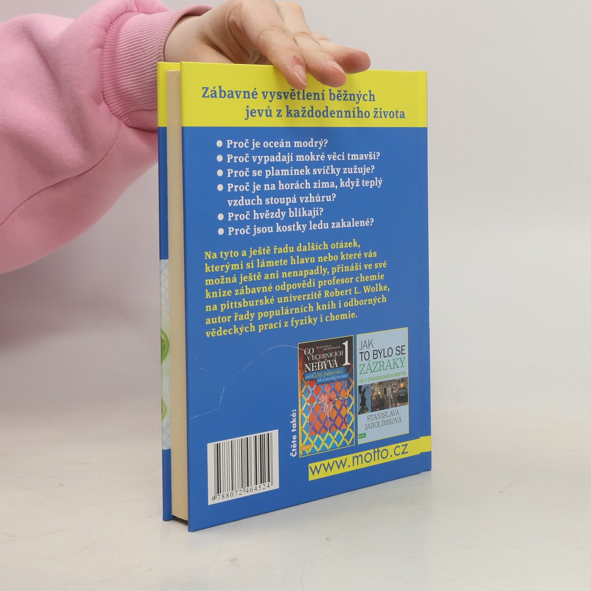 Zábavné vysvětlení běžných jevů z každodenního života. Profesor chemie na pittsburské univerzitě Robert. L. Wolke ve své úspěšné knize přináší zábavné odpovědi na řadu otázek, s kterými si dennodenně lámete hlavu, např. proč vypadají mokré věci tmavší, proč hvězdy blikají či proč se plamínek svíčky zužuje.
