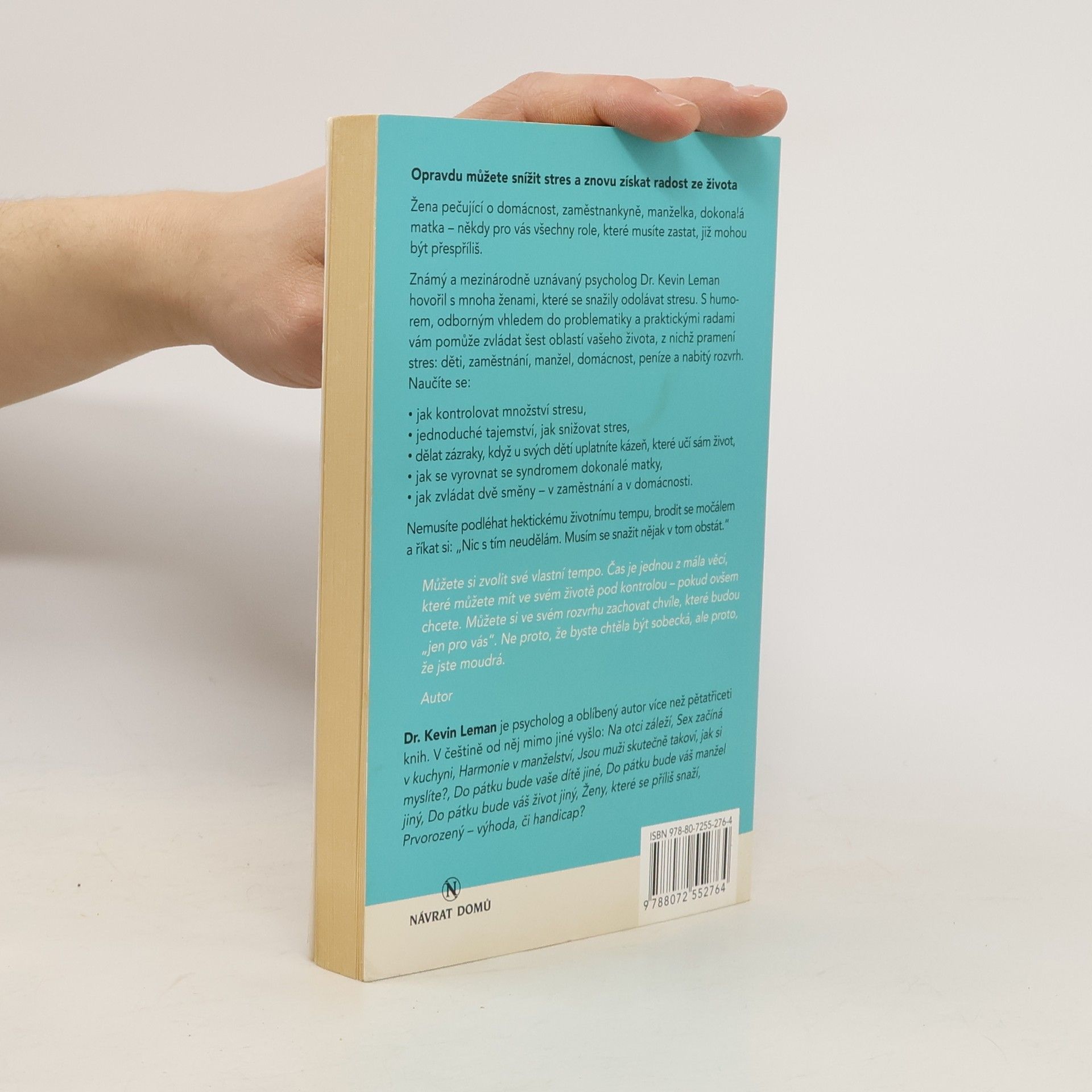 Než stres přemůže vás. Opravdu můžete snížit stres a znovu získat radost ze života. Žena pečující o domácnost, zaměstnankyně, manželka, dokonalá matka - někdy pro vás všechny role, které musíte zastat, již mohou být přespříliš. Známý a mezinárodně uznávaný psycholog Dr. Kevin Leman hovořil s mnoha ženami, které se snažily odolávat stresu. S humorem, odborným vhledem do problematiky a praktickými radami vám pomůže zvládat šest oblastí vašeho života, z nichž pramení stres: děti, zaměstnání, manžel, domácnost, peníze a nabitý rozvrh. Naučíte se: - jak kontrolovat množství stresu, - jednoduché tajemství, jak snižovat stres, - dělat zázraky, když u svých dětí uplatníte kázeň, které učí sám život, - jak se vyrovnat se syndromem dokonalé matky, - jak zvládat dvě směny - v zaměstnání a v domácnosti. Nemusíte podléhat hektickému životnímu tempu. Čas je jednou z mála věcí, které můžete mít ve svém životě pod kontrolou - pokud ovšem chcete. Můžete si ve svém rozvrhu zachovat chvíle, které budou "jen pro vás". Ne proto, že byste chtěla být sobecká, ale proto, že jste moudrá.