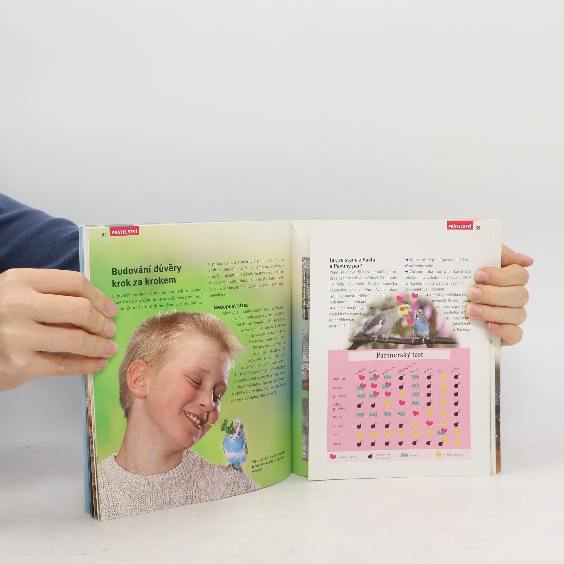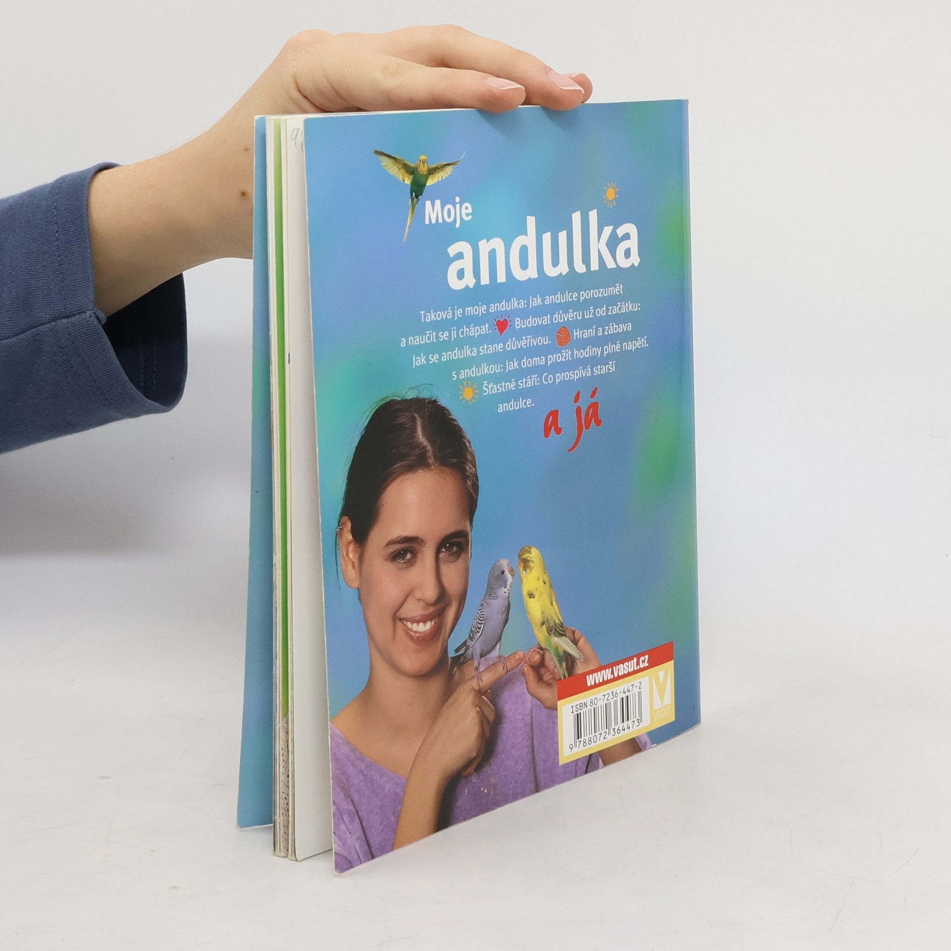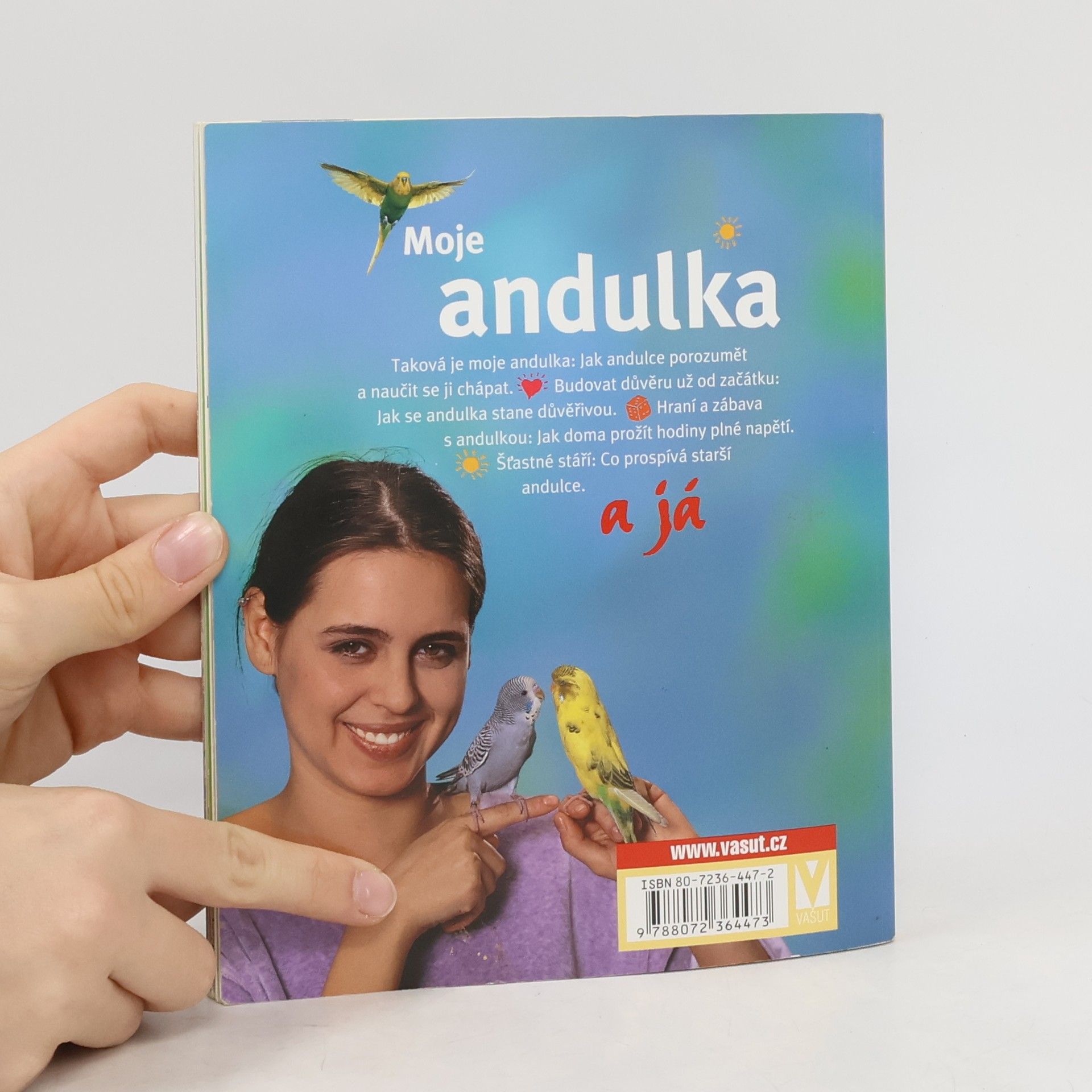 Taková je moje andulka: Jak andulce porozumět a naučit se jí chápat. Budovat důvěru už od začátku: Jak se andulka stane důvěřivou. Hraní a zábava s andulkou: Jak prožít doma hodiny plné napětí. Šťastné stáří: Co prospívá starší andulce. S přílohami na rozkádacích stránkách. Mnoho zajímavých testů. Aby andulka byla zdravá a cítila se dobře.
