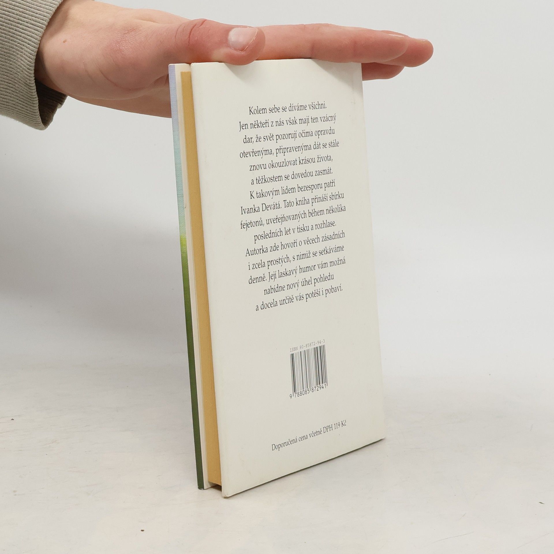 Kolem sebe se díváme všichni. Jen někteří z nás však mají ten vzácný dar, že svět pozorují očima opravdu otevřenýma, připravenýma dát se stále znovu okouzlovat krásou života, a těžkostem se dovedou zasmát. K takovým lidem bezesporu patří Ivanka Devátá. Tato kniha přináší sbírku fejetonů, uveřejňovaných během několika posledních let v tisku a rozhlase. Autorka zde hovoří o věcech zásadních i zcela prostých, s nimiž se setkáváme denně. Její laskavý humor vám možná nabídne nový úhel pohledu a docela určitě vás potěší i pobaví.