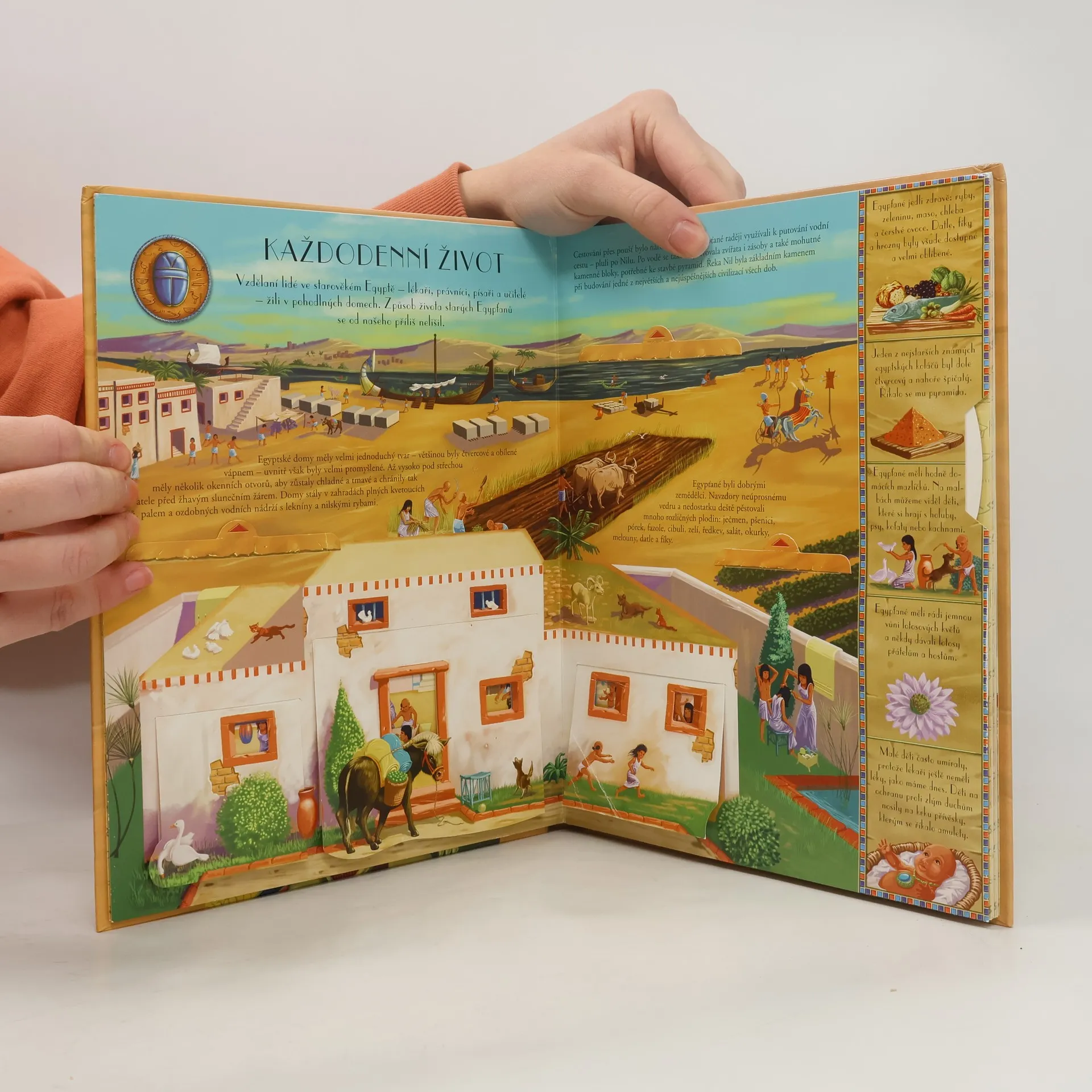 Pojďme se společně podívat na egyptské památky zblízka a prozkoumejme stavby a předměty staré tisíce let. Prohlédneme si pyramidy a odhalíme jejich tajemství, zjistíme jaký účel má sfinga, podíváme se na objevené hrobky faraónů, podrobně se seznámíme s mumifikací těl bohatých Egypťanů, zjistíme jaké účesy nosili muži a ženy ve starověkém Egyptě, a to vše díky důmyslným vyklápěcím a vysouvacím obrázkům a působivým trojrozměrným skládačkám. (se zábavnými obrázky a skrytými překvapeními)