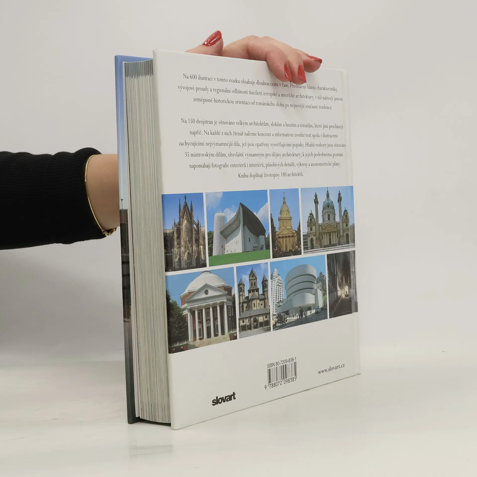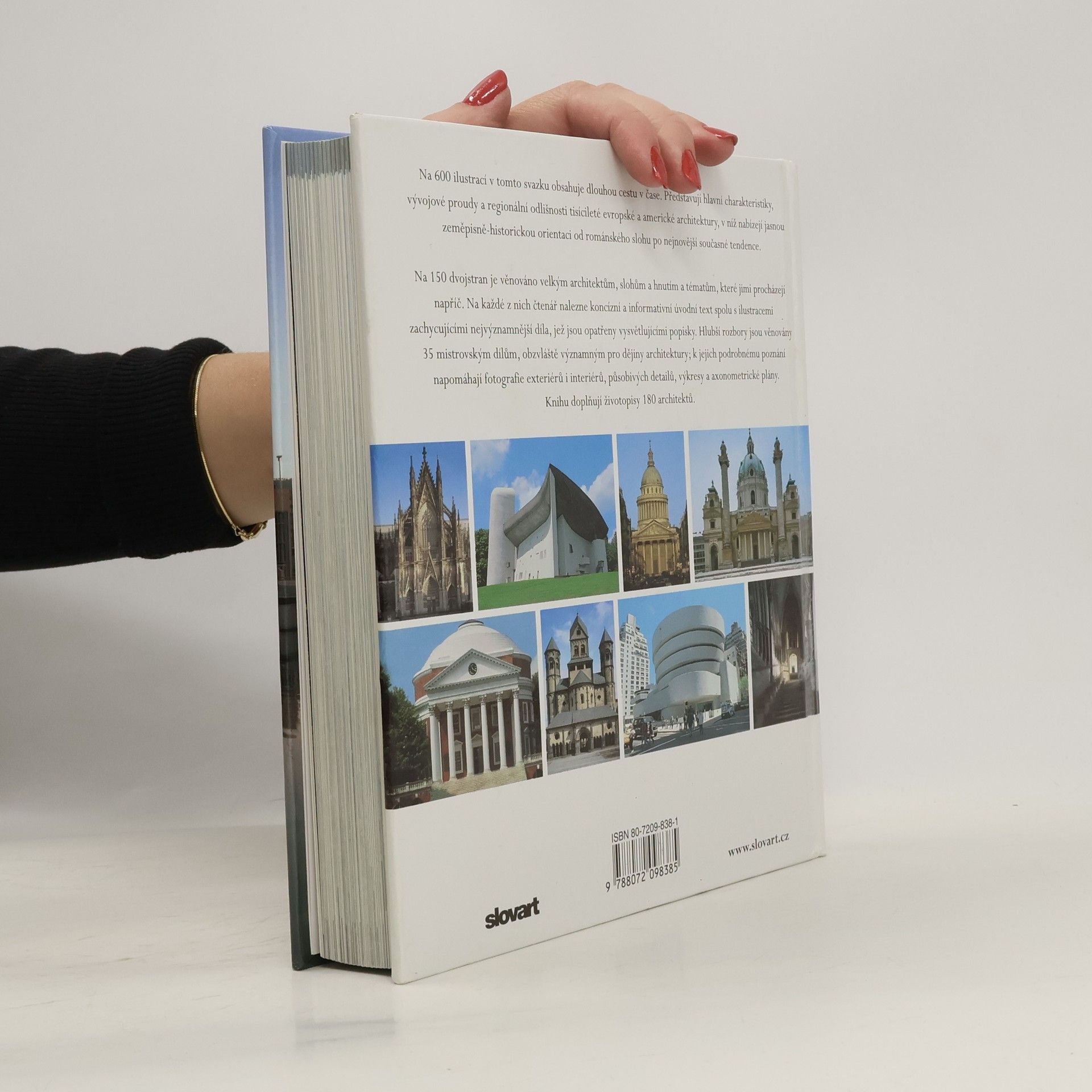 Nový typ přehledného zpracování vývoje a představitelů světové architektury. Velice rozsáhlá publikace představuje hlavní charakteristiky, vývojové proudy a regionální odlišnosti tisícileté evropské a americké architektury, v níž nabízejí jasnou zeměpisně-historickou orientaci od románského slohu po nejnovější současné tendence. Na 150 dvojstran je věnováno velkým architektům, slohům a hnutím a tématům, které jimi procházejí napříč. Hlubší rozbory jsou věnovány 35 mistrovským dílům, obzvláště významným pro dějiny architektury. K jejich podrobnému poznání napomáhají fotografie exteriérů i interiérů, působivých detailů, výkresy a axonometrické plány. Knihu doplňují životopisy 180 architektů. Rozsáhlá publikace se skládá ze dvou hlavních částí: Atlasu a příloh. Atlas zahrnuje 148 témat, z nichž o každém se pojednává na dvoustraně, a k nim se připojují další detailní a hlubší informace o 36 mistrovských dílech architektury všech dob. Každá strana je charakterizovaná záhlavím, ve kterém je uveden název, místo a doba a barevný pruh, odlišující jednotlivé architektonické styly: románský sloh, gotika, renesance, baroko a rokoko a historicismus. Přílohy jsou pojaty jako informativní pomůcka k Atlasu.