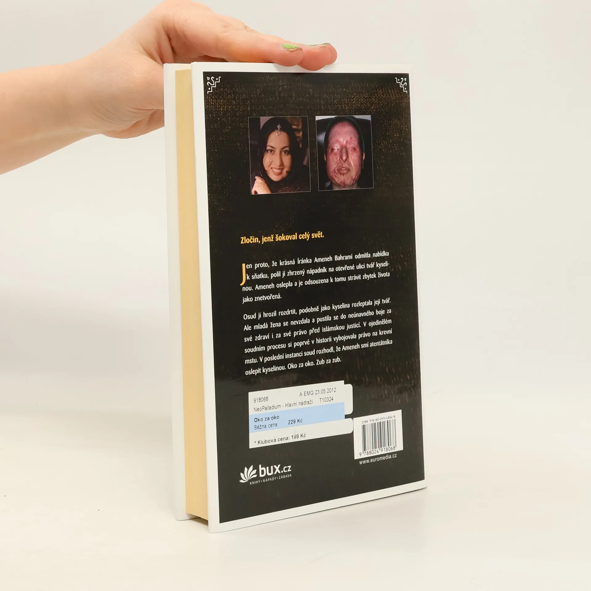 Zločin, který šokoval celý svět. Jen proto, že krásná Íránka Ameneh Bahramí odmítla nabídku k sňatku, polil jí odmítnutý nápadník na otevřené ulici tvář kyselinou. Ameneh oslepla a je odsouzena k tomu, aby zbytek života strávila jako znetvořená. Osud ji hrozil rozdrtit, podobně jako kyselina rozleptala její tvář. Ale mladá žena se vrhla do neúnavného boje za své zdraví i za své právo před islámskou justicí. V ojedinělém soudním procesu si poprvé v historii vybojovala právo na krevní mstu. V poslední instanci soud rozhodl, že Ameneh smí atentátníka oslepit kyselinou. A rozsudek má být vykonán co nejdřív. Oko za oko. Zub za zub.