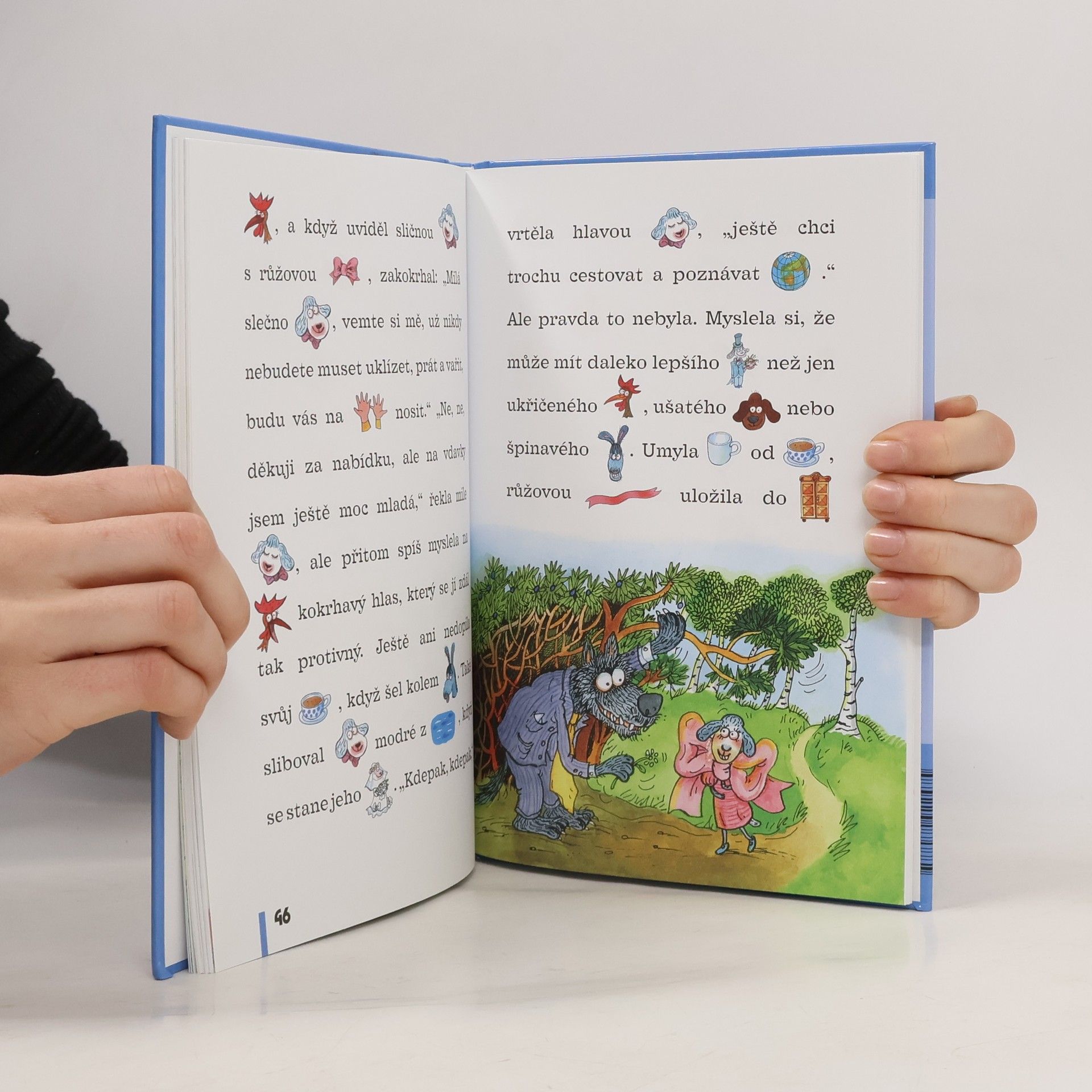 Veselé příběhy, na motivy klasický pohádek, ve kterých jsou desítky slov nahrazeny obrázky. Tzv. „dvojhlasné čtení“, kdy dospělý předčítá a dítě doplňuje malovaná slova, hravou formou rozvíjí slovní zásobu dítěte i schopnost reprodukovat vyprávěný text. V závěru každé kapitoly jsou jednoduché úkoly, které prověří do jaké míry si dítě text zapamatovalo. Na konci knihy je slovníček všech malovaných slov. Jednotlivé pohádky doplňují celostranové barevné ilustrace.