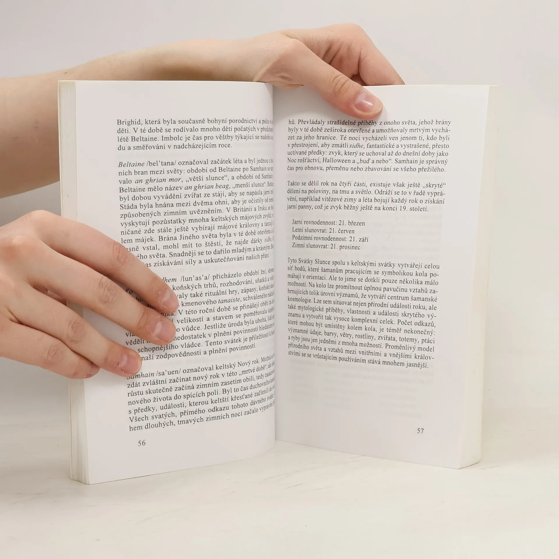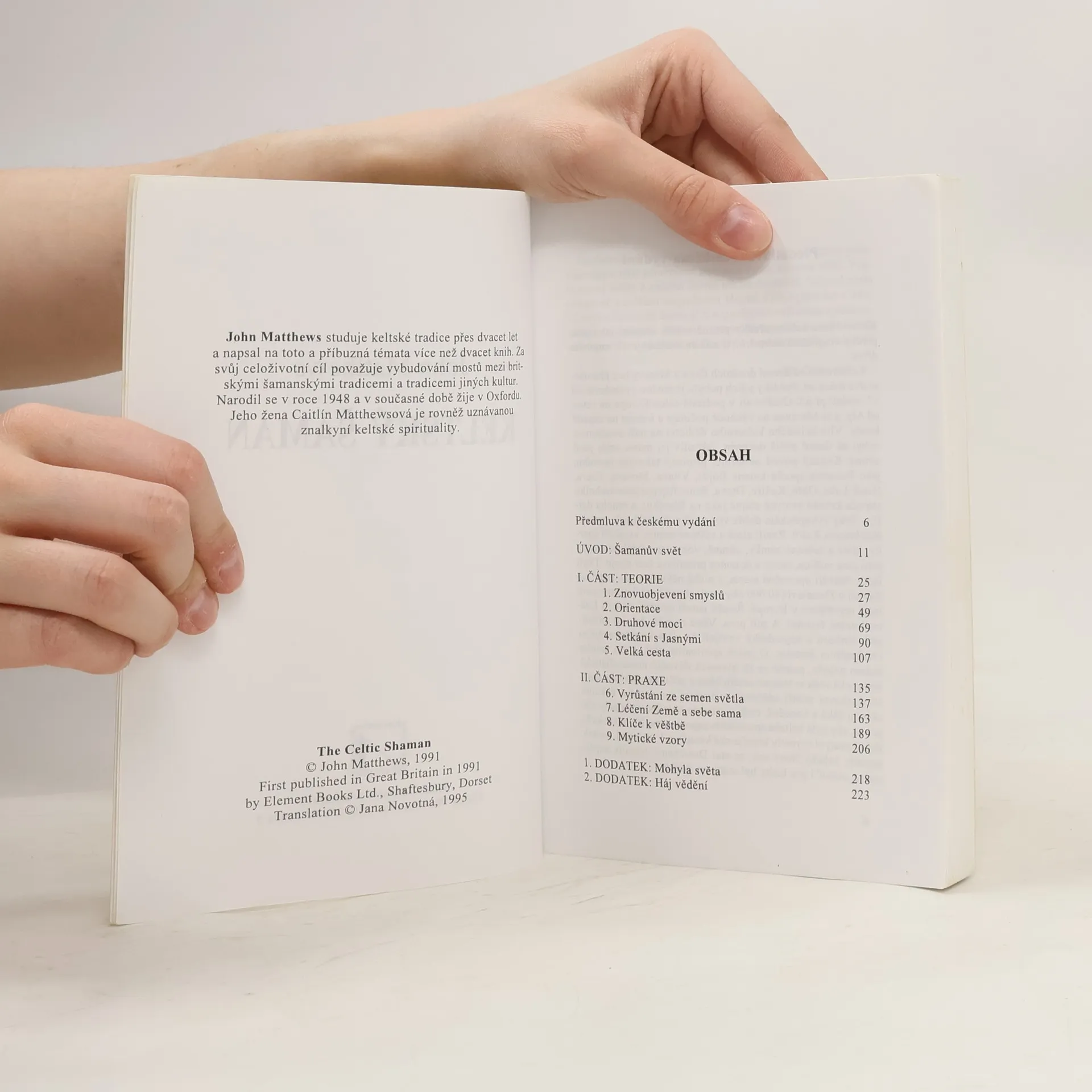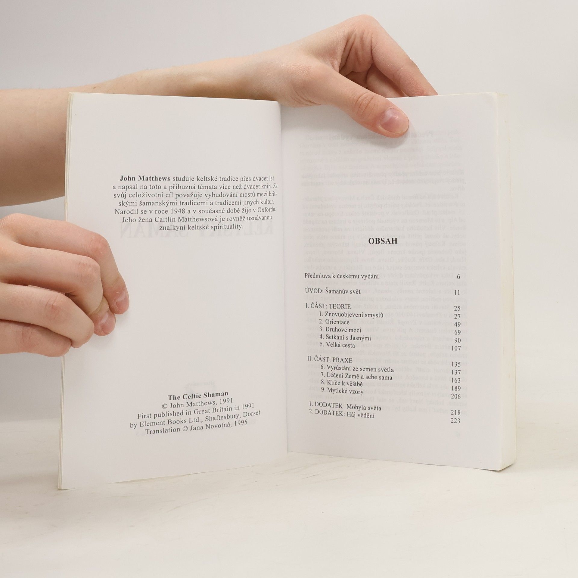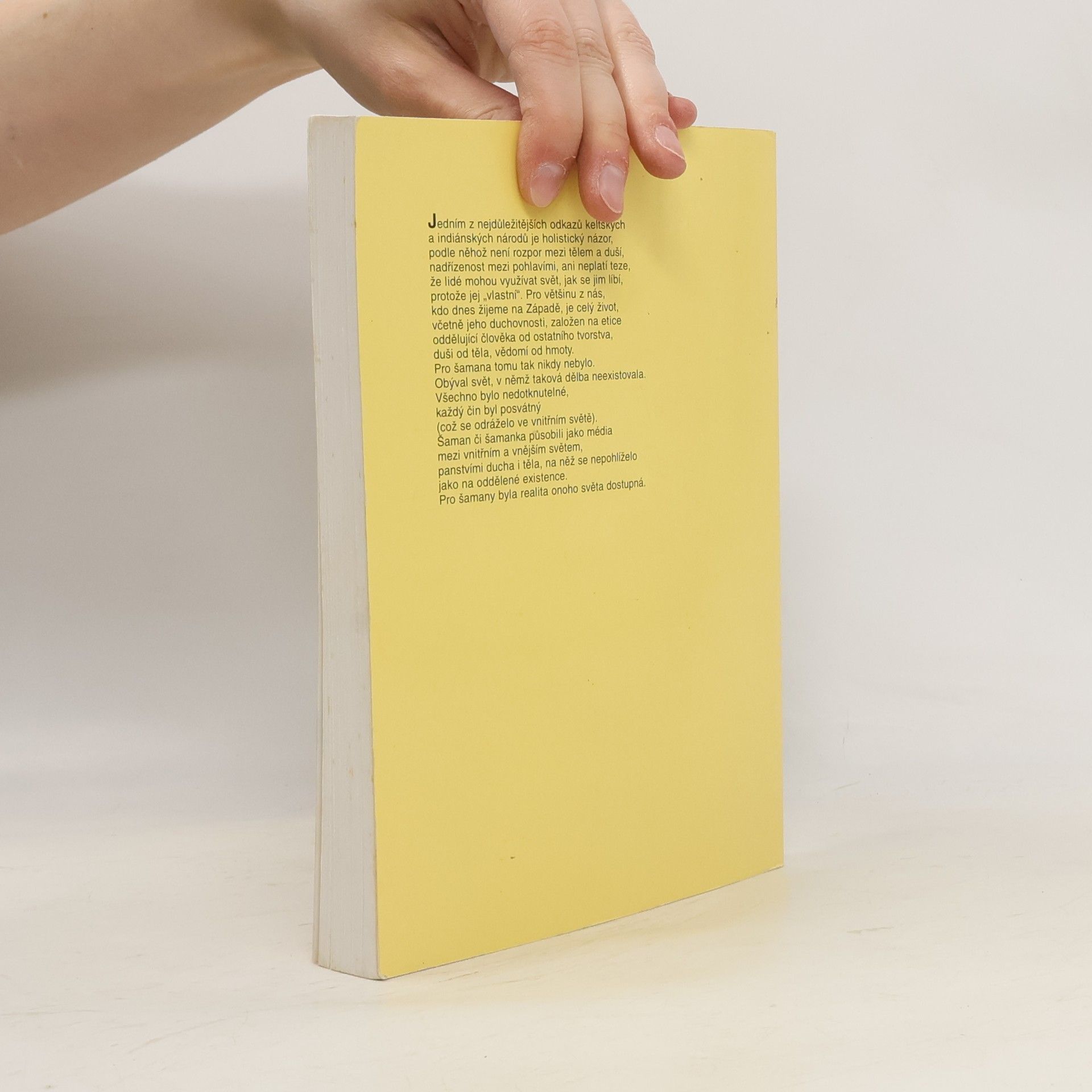 Keltská spiritualita v současné době; z obsahu: Šamanův svět, znovuobjevení smyslů, druhové moci, léčení Země a sebe sama. Jedním z nejdůležitějších odkazů keltských a indiánských národů je holistický názor, podle nehož není rozpor mezi tělem a duší, nadřízenost mezi pohlavími, ani neplatí teze, že lidé mohou využívat svět, jak se jim líbí, protože jej "vlastní". Pro většinu z nás je celý život, včetně jeho duchovnosti, založen na etice oddělující člověka od ostatního tvorstva, duši od těla, vědomí od hmoty. Pro šamana tomu tak nikdy nebylo. Obýval svět, v němž taková dělba neeexistovala. Všechno bylo nedotknutelné, každý čin byl posvátný. Šaman působil jako médium mezi vnitřním a vnějším světem, panstvím ducha i těla, na něž se nepohlíželo jako na oddělené existence. Pro šamany byla realita onoho světa dostupná. Kapitoly: Šamanův svět, Teorie-Znovuobjevení smysů, Orientace, Druhové moci, Setkání s Jasnými, Velká cesta. Praxe-Vyrůstání ze semen světla, Léčení Země a sebe sama, Klíče k věštbě, Mýtické vzory. Mohyla světa, Háj vědění. Dotisk v roce 1998.
