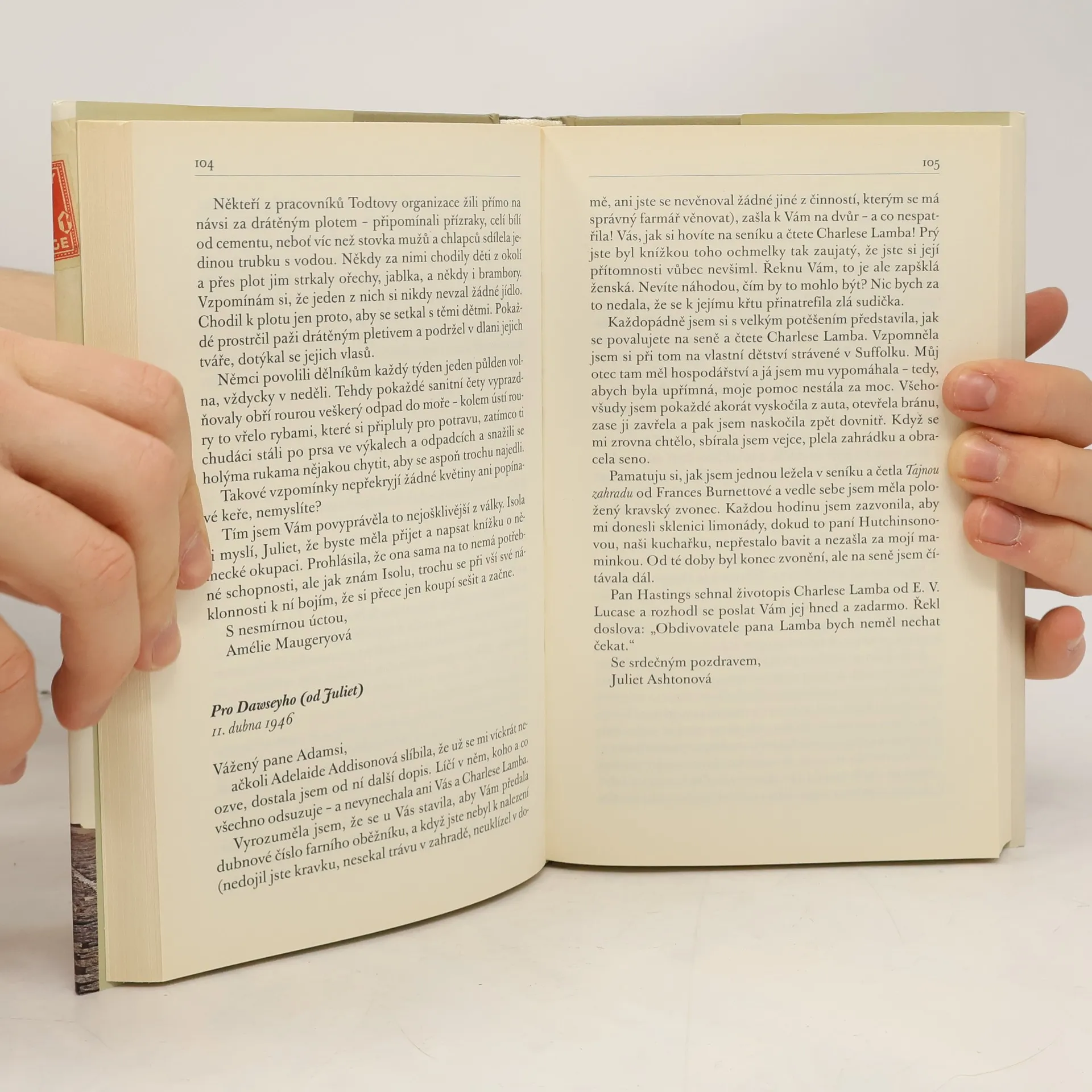Je krátce po druhé světové válce a Juliet Ashtonová, úspěšná autorka humoristických esejů vydaných pod názvem Izzy Bickerstaff rukuje, se rozhlíží po námětu na novou knihu. Shodou okolností se prostřednictvím korespondence s jedním z jeho členů dozvídá o Spolku přátel krásné literatury a koláče z bramborových slupek, který během války založili obyvatelé okupovaného ostrova Guernsey, a jejich osudy ji natolik zaujmou, že se je rozhodne navštívit osobně. Juliet sama prožila válku v Londýně, kde neustále hrozilo bombardování, ale nikdy nepoznala přímý styk s nepřítelem a izolaci od okolního světa, jaké byli vystaveni ostrované. Guernsey má, tak jako celý svět, svoje podvodníčky, opilce a podivíny, dobráky, závistivce i hrdiny, a z jejich humorného i dojemného vyprávění začíná před Juliet vyvstávat živý obrázek společenství, kde v těžkých dobách krystalizují lidské povahy a osudy se proplétají zcela nečekaným způsobem. Kdy jindy by se mohlo stát, aby byl při tajných vepřových hodech založen čtenářský spolek, zvlášť když většina jeho členů jakživa nedržela v ruce jinou knihu než bibli? A co víc, aby noví čtenáři našli i v náročných knihách poselství, které je zaujme, a aby je četba podnítila k vášnivým diskusím na nejrůznější témata. Juliet se na ostrově dostane víc než srdečného přijetí a brzy se ukáže, že v novém prostředí dost možná najde víc než inspiraci pro svoji další knihu.