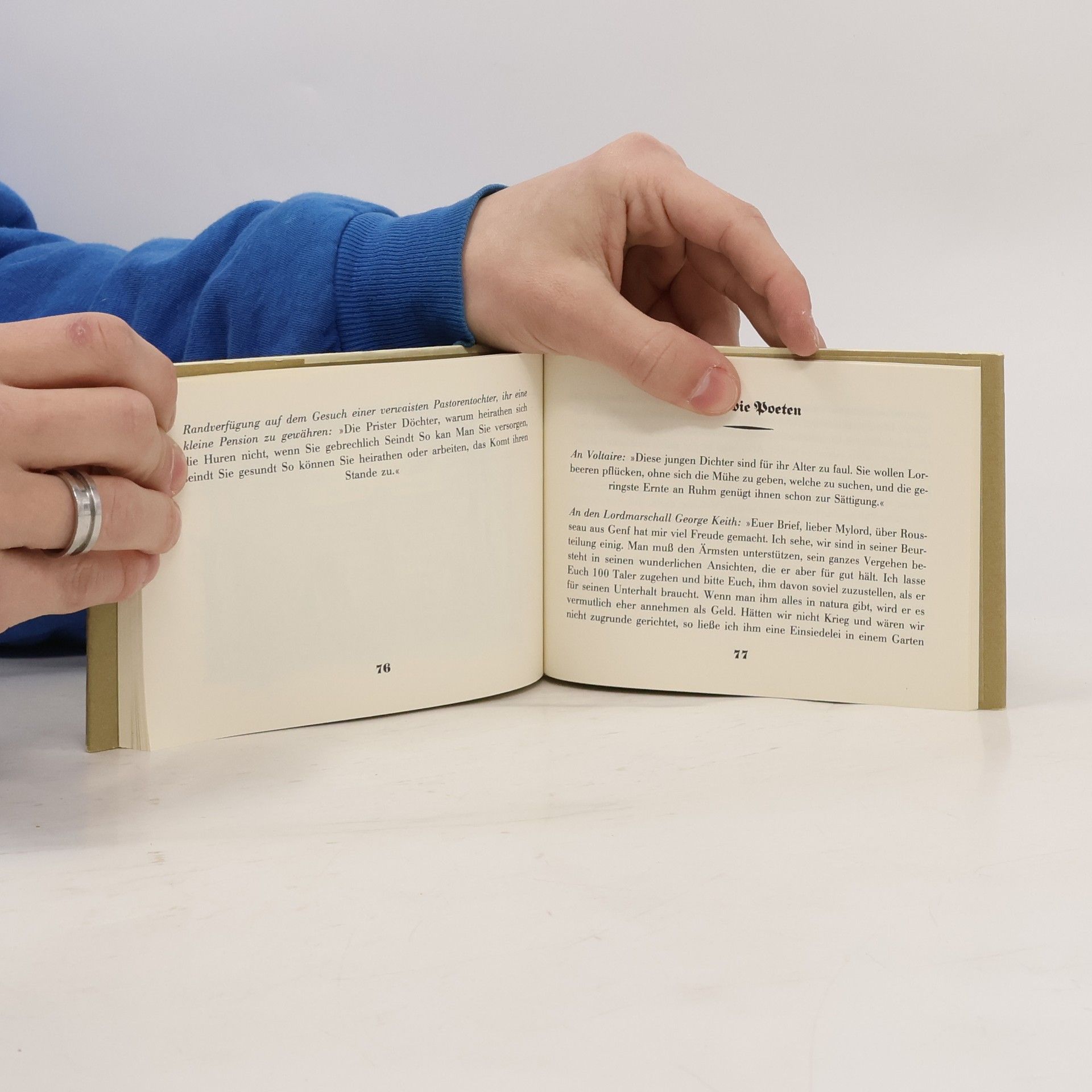 Friedrich II. war eine Ausnahme unter den Königen seiner Zeit. Wo fand man einen Monarchen, der wie ein Eremit lebte? Der aufstand, wenn andere Herrscher zu Bett gingen? Der sein Vergnügen nicht im Ballsaal oder am Spieltisch, sondern in der Unterhaltung und in der Erfüllung seiner Pflichten sah? Es gehörte auch zu den Eigenheiten des friderizianischen Regierungsstils, daß alles über seinen Schreibtisch ging - das Wichtige wie das Unwichtige, das Ernste wie das Lächerliche. Die Verfügungen, die Friedrich an den Rand der Akten kritzelte, die Kabinettsordern und Briefe sind eine fesselnde Lektüre. Sie zeigen einen klugen, pragmatischen Kopf, dem niemand ein X für ein U vormachte, einen Denker von sprachlicher Originalität und manchmal geistreicher Bosheit.
