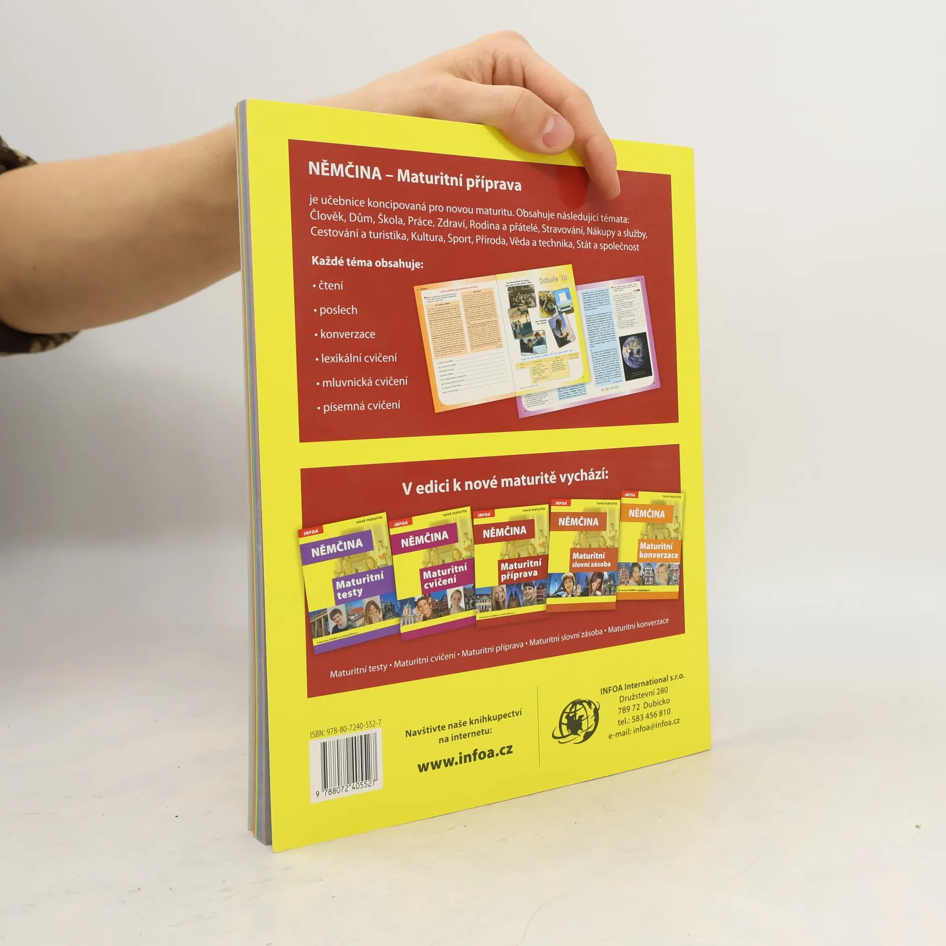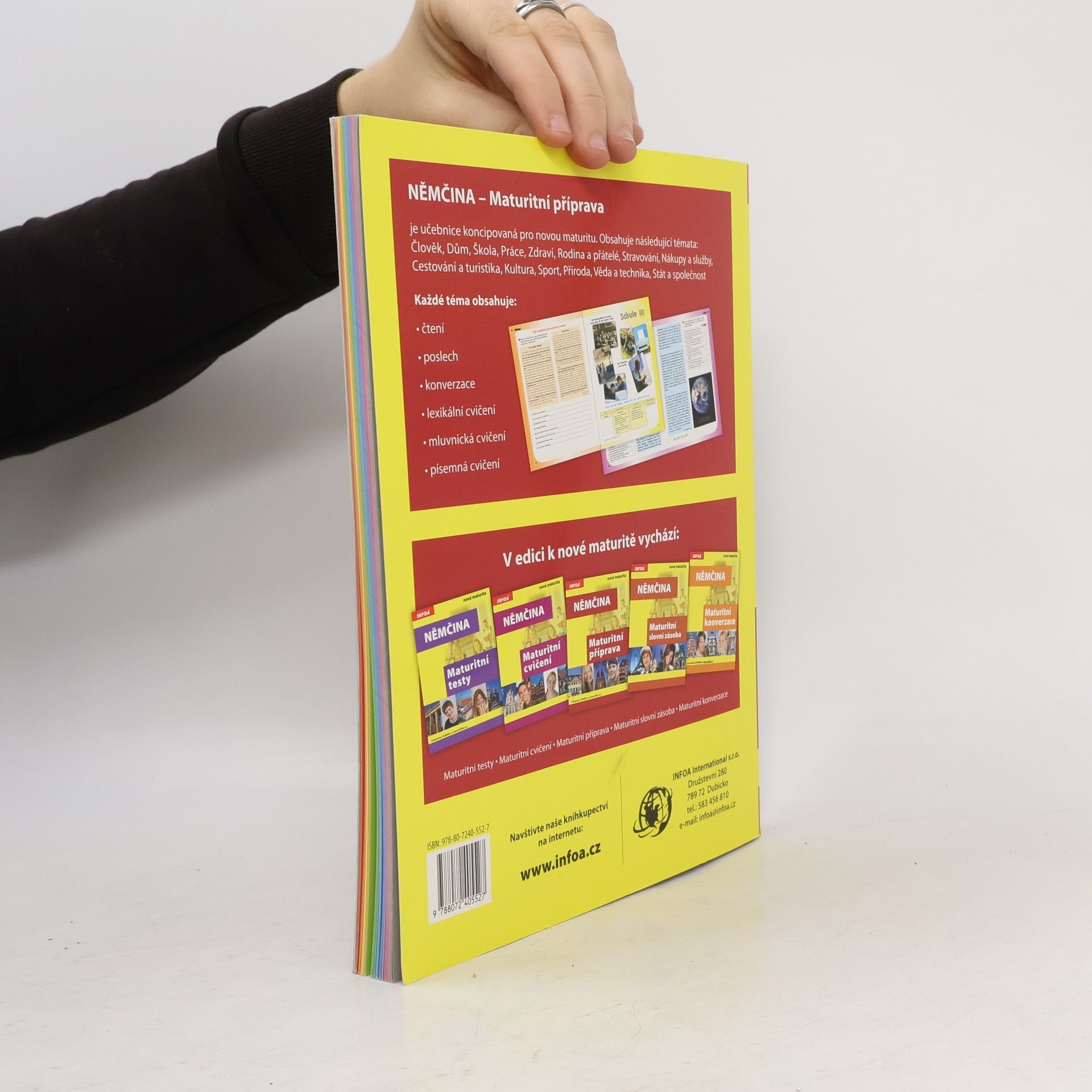 Učebnice je koncipována pro novou státní maturitu. Obsahuje témata jako Člověk, Dům, Škola, Práce, Zdraví, Rodina, Nákupy, Sport, Stát a společnost atd. Každé téma obsahuje lexikální cvičení, mluvnická cvičení, čtení, poslech, konverzaci a písemná cvičení