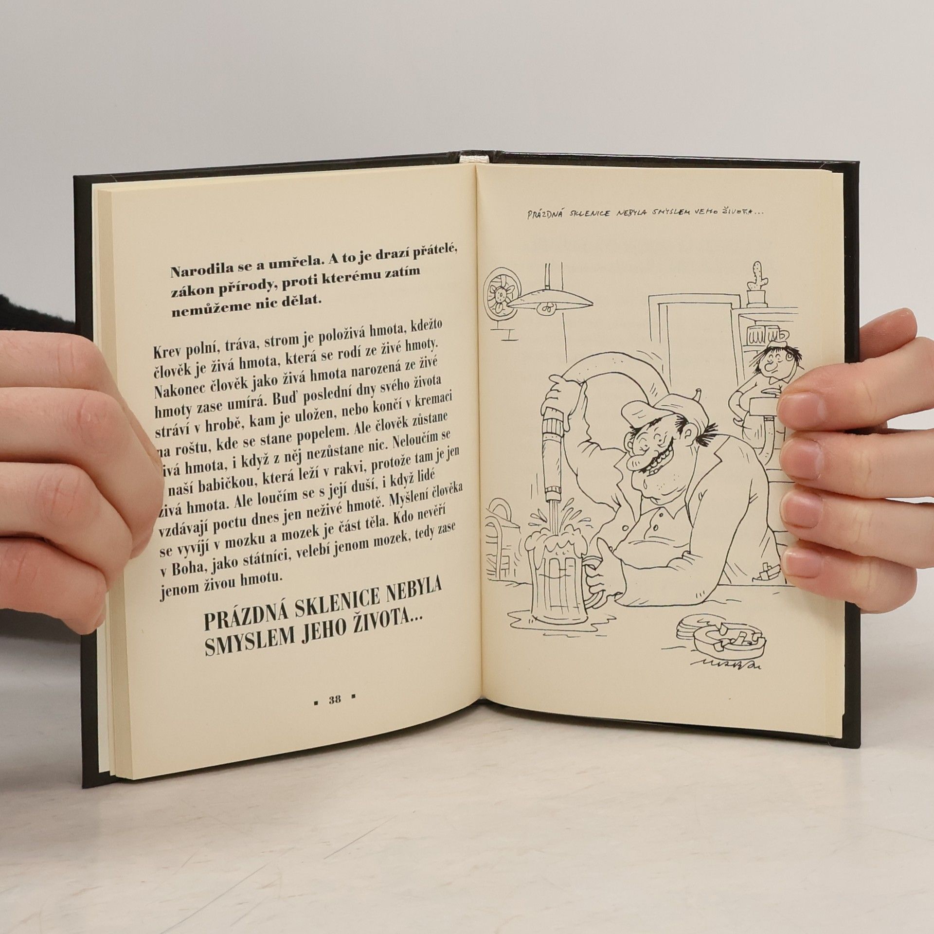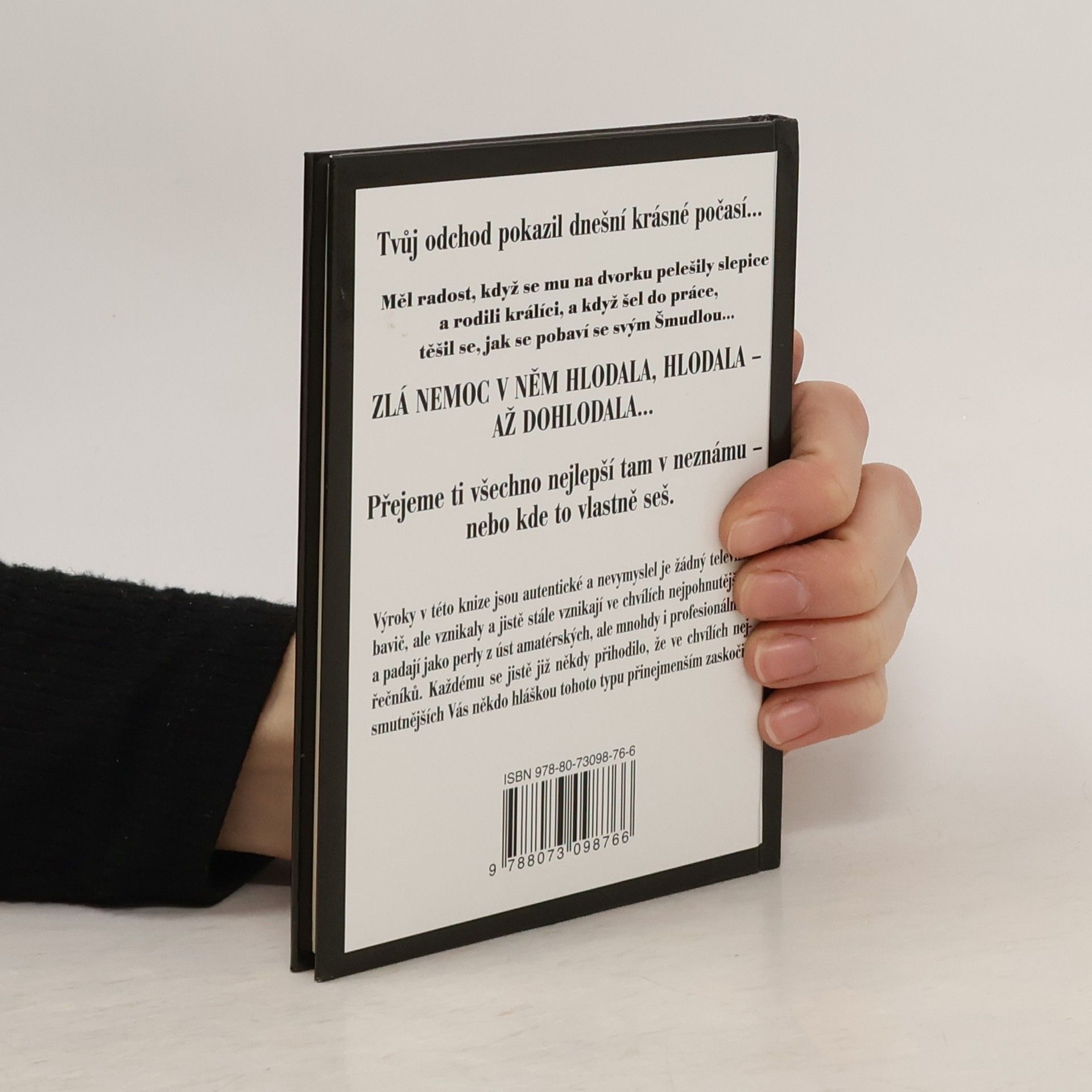 "Průpovídky ze hřbitovů a krematorií". Výroky v této knize (''Tvůj odchod pokazil dnešní krásné počasí...'', ''Zlá nemoc v něm hlodala, hlodala - až dohlodala...'', ''Znal cenu funkce, kterou vykonával'') jsou autentické a nevymyslel je žádný televizní bavič, ale vznikaly a jistě stále vznikají ve chvílích nejpohnutějších a padají jako perly z úst amaterských, ale mnohdy i profesionálních řečníků. Každému se jistě již někdy přihodilo, že ve chvílích nejsmutnějších Vás někdo hláškou tohoto typu přinejmenším zaskočil.