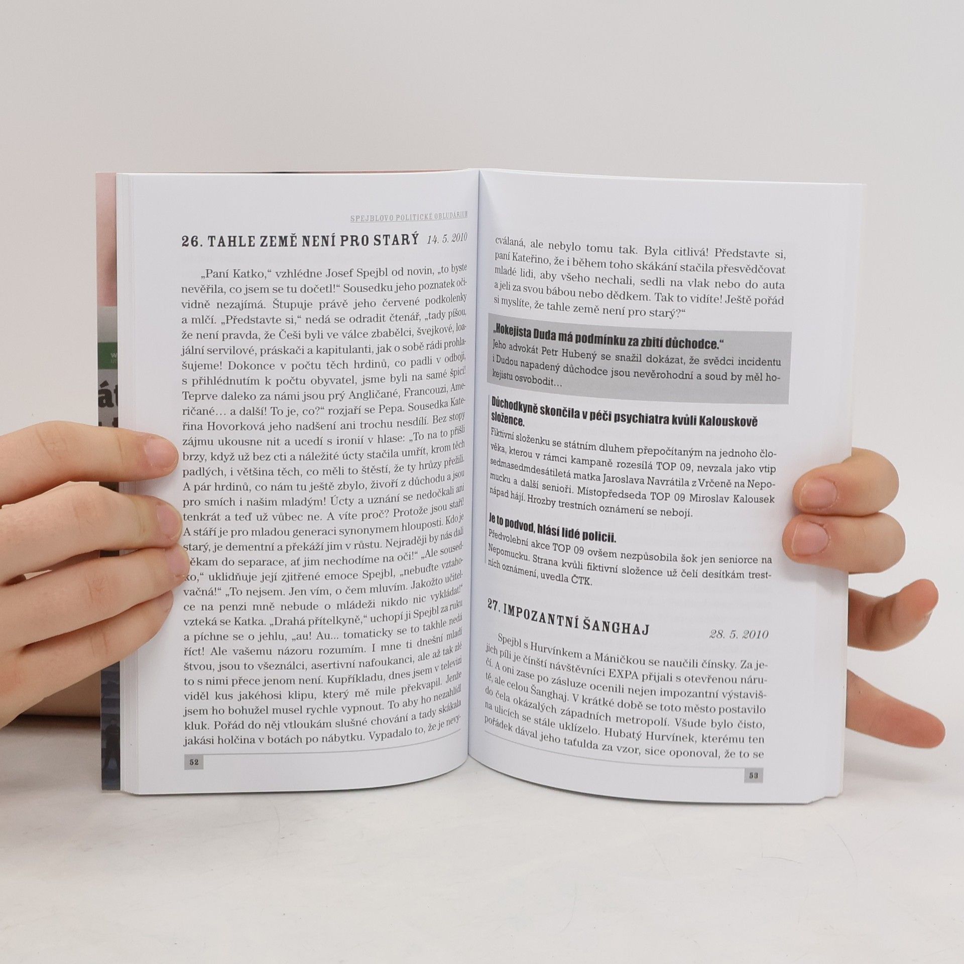 Politický a společenský život současnosti aneb jak to vidí Spejbl, Hurvínek a jejich dámské protějšky. Kniha obsahuje téměř 70 sloupků na nejrůznější témata, např.: Elita národa Sexy mozek Hurvínek jde na lup Šťabajzna se psem Tahle země není pro starý Papežovy kondomy Jak mazánek s kolibříkem spapali bonboniérku