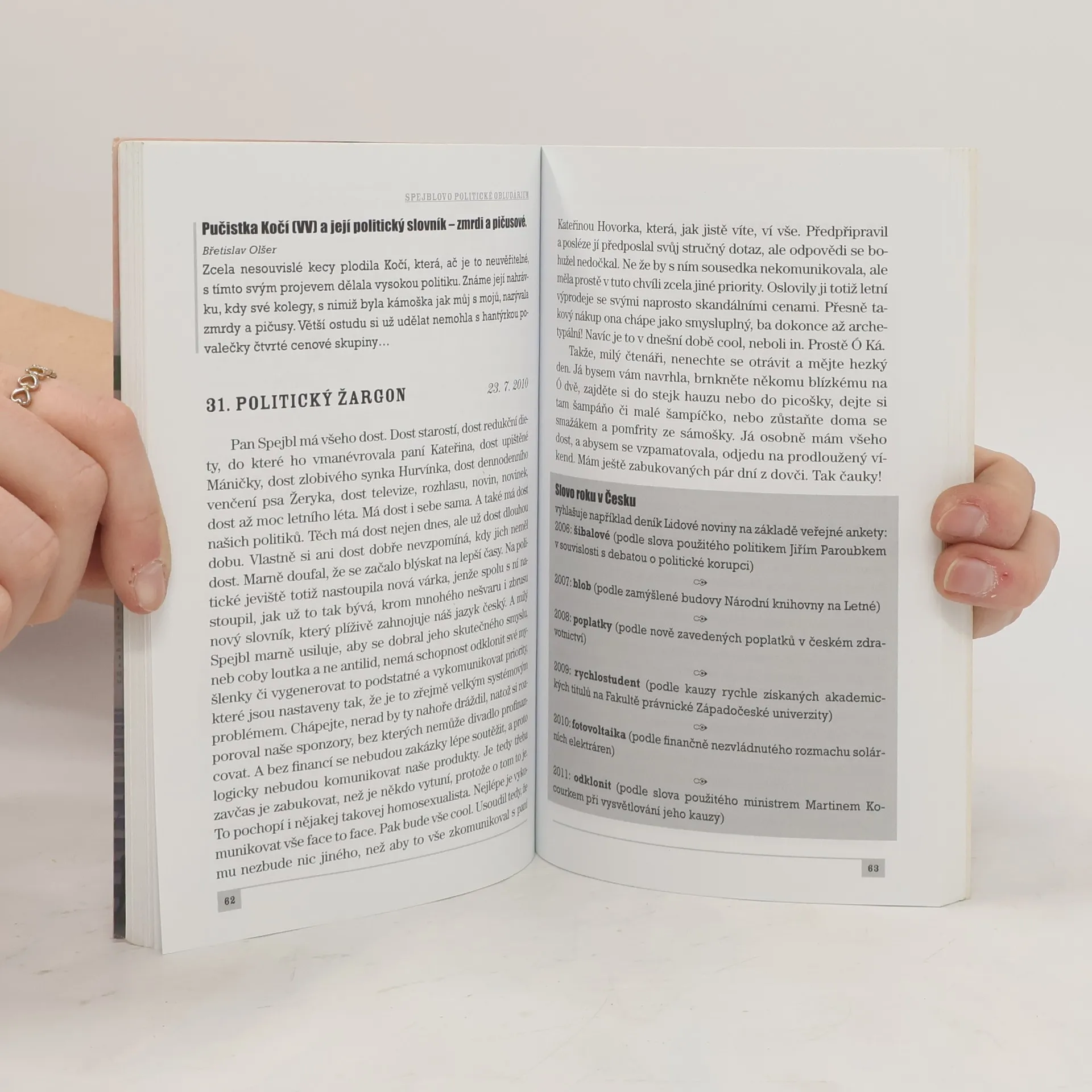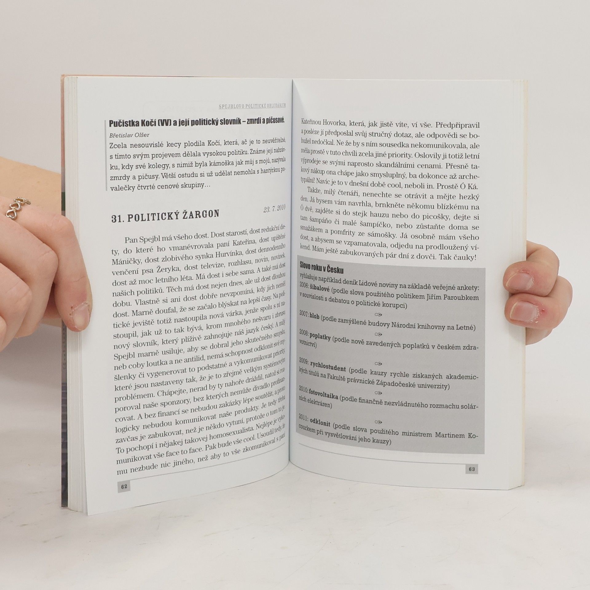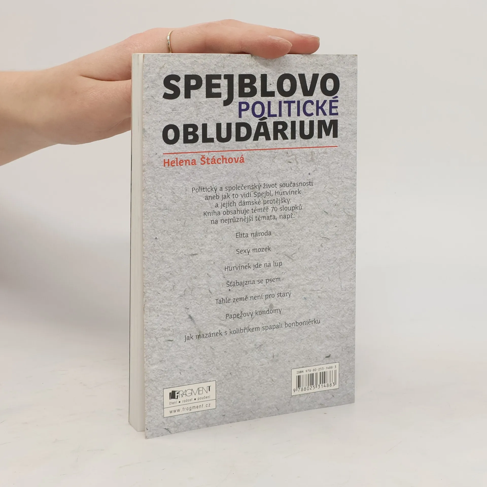 Politický a společenský život současnosti aneb jak to vidí Spejbl, Hurvínek a jejich dámské protějšky. Kniha obsahuje téměř 70 sloupků na nejrůznější témata, např.: Elita národa Sexy mozek Hurvínek jde na lup Šťabajzna se psem Tahle země není pro starý Papežovy kondomy Jak mazánek s kolibříkem spapali bonboniérku