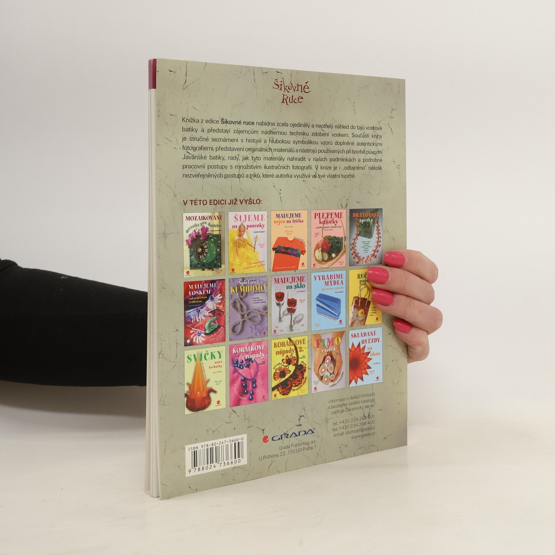 Kniha nabízí zcela ojedinělý a neotřelý pohled do tajů voskové batiky a představí zájemcům nádhernou techniku zdobení voskem. Součástí knihy je stručné seznámení s historií a hlubokou symbolikou vzorů, doplněné autentickými fotografiemi, představení originálních materiálů a vzorů používaných při tvorbě původní Javánské batiky, rady, jak tyto materiály nahradit v našich podmínkách a podrobné pracovní postupy s množstvím postupových fotografií. V knize je i "odtajněno" několik dosud nezveřejněných postupů a triků, kterých autorka využívá ve vlastní tvorbě.