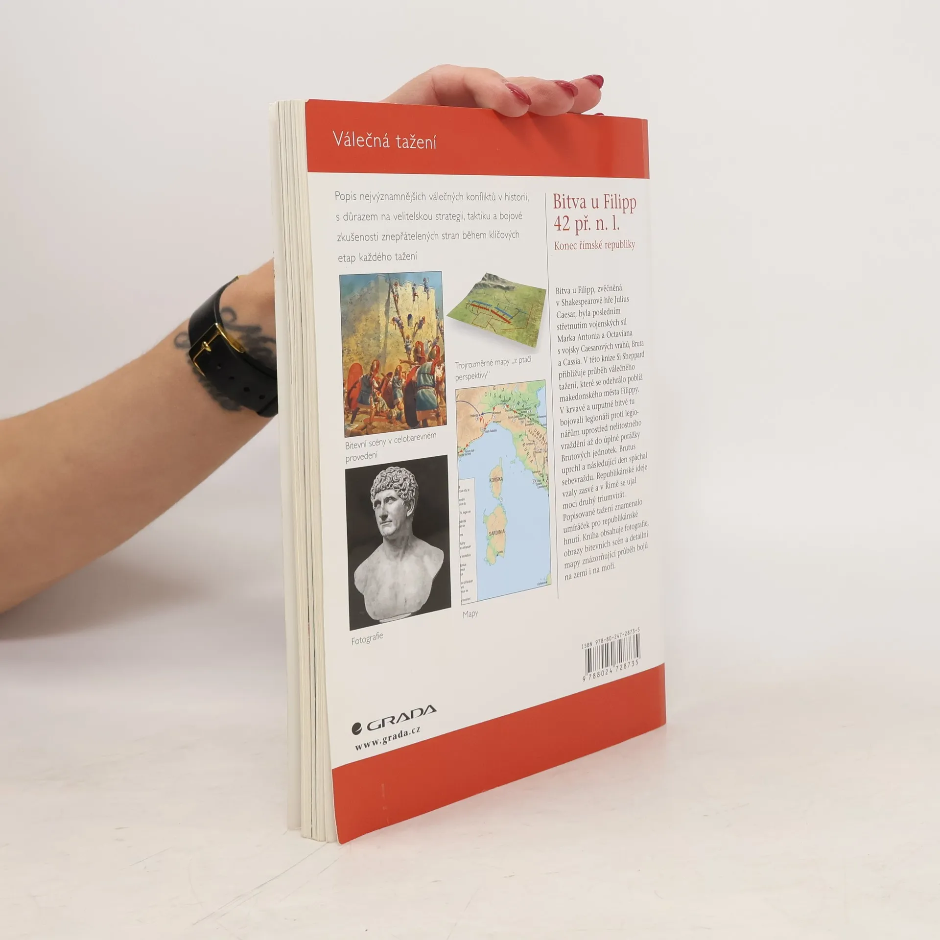 Ústředním tématem této knížky je situace, která nastala po zavraždění Caesara, a dramatické události, které následovaly poté, co se vydali Antonius a Octavianus pronásledovat Caesarovy vrahy Bruta a Cassia. Autorovo nadání napínavě a zároveň s odbornou znalostí vylíčit motivy spiklenců, měnící se politické klima, průběh občanské války, zápletky vztahu dvou hlavních aktérů Antonia a Octaviana, strukturu římského vojska a konečné zúčtování s republikány, které osudově ovlivnilo další vývoj Říma, činí z této knížky skvělou četbu a příležitost důkladněji poznat významnou část římských dějin. Ani v tomto svazku Válečných tažení samozřejmě nechybějí mapy a množství barevných a černobílých ilustrací.