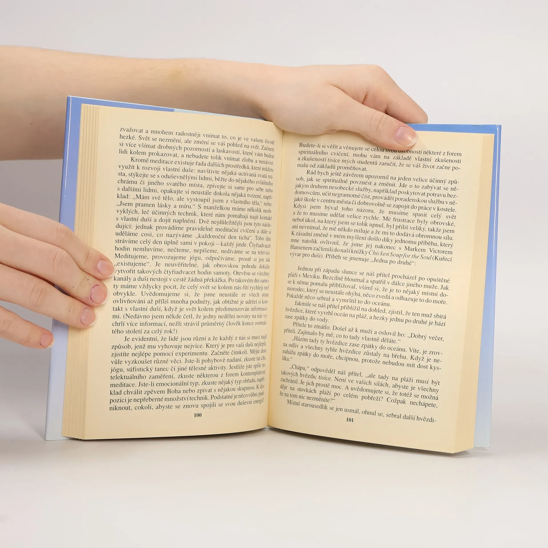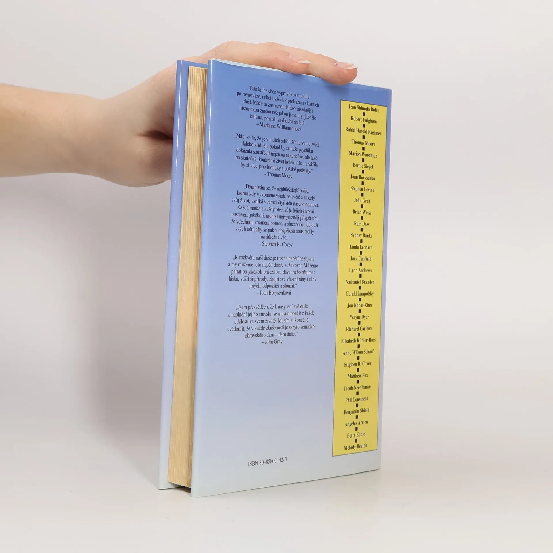 Kniha je sborníkem úvah předních amerických autorů, kteří se zabývají psychikou člověka. Mezi přispěvateli najdeme Thomase Moora, Marriannu Williamsonovou, Jacka Canfielda a Roberta Fulghuma, kteří nabízejí inspirující názory na postavení duše v dnešním světě. Tato sbírka více než třiceti originálních úvah se zaměřuje na význam pěstění a rozvoje ducha, přičemž poskytuje praktické metody, jak jednotlivci pečovat o svou duši v každodenním životě. Autoři se dělí o své názory na různá témata, jako jsou "Vaše duše chytá druhý dech", "Duše v každodenním životě", "Duševní lekce" a "Návrat k duši". Thomas Moore se zamýšlí nad vyrovnáváním se s každodenností, Bernie Siegel se věnuje lásce jako výtvoru duše, a Betty Eadieová píše o božském duchu. Další příspěvky zahrnují "Vitamíny lásky pro vaši duši" od Johna Graye, "Svědomí coby průvodce" od Stephena Coveyho, a "Okna do duše" od Jean Shinoda Bolenové. Ram Dass nás vede na "Pouti vědomí", Joan Borysenková radí, jak se stát oduševnělým, a Melody Beattieová přednáší "Lekce lásky, lekce naděje". Tento soubor inspirujícího čtení nás vyzývá k prozkoumání hlubin vlastního nitra, abychom lépe porozuměli své duši a nalezli naplnění v životě.