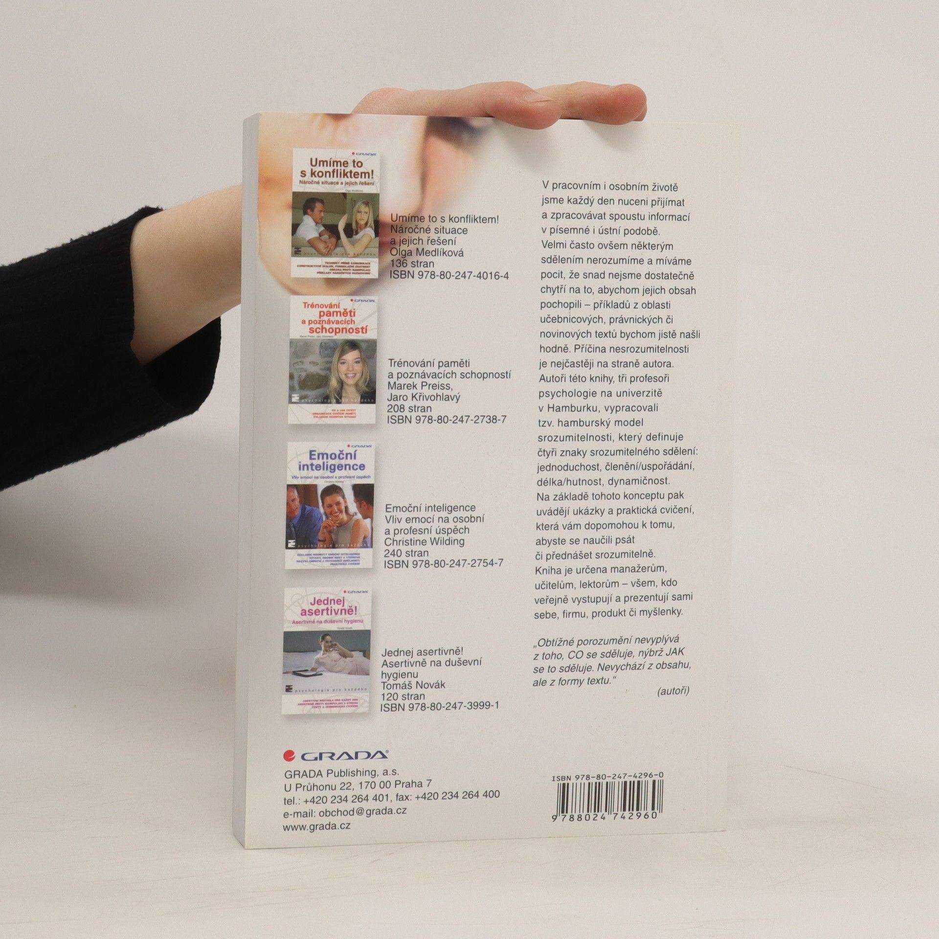 Friedemann Schulz von Thun V pracovním i osobním životě jsme každý den nuceni přijímat a zpracovávat spoustou informací v písemné i ústní podobě. Velmi často ovšem některým sdělením nerozumíme a míváme pocit, že snad nejsme dostatečně chytří na to, abychom jejich obsah pochopili – příkladů z oblasti učebnicových, právnických či novinových textů bychom jistě našli hodně. Příčina nesrozumitelnosti je nejčastěji na straně autora. Autoři této knihy, tři profesoři psychologie na univerzitě v Hamburku, vypracovali tzv. hamburský model srozumitelnosti, který definuje čtyři znaky srozumitelného sdělení: jednoduchost, členění/uspořádání, délka/hutnost, dynamičnost. Na základě tohoto konceptu pak uvádějí ukázky a praktická cvičení, která vám dopomohou k tomu, abyste se naučili psát či přednášet srozumitelně. Kniha je určena manažerům, učitelům, lektorům – všem, kdo veřejně vystupují a prezentují sami sebe, firmu, produkt či myšlenky.