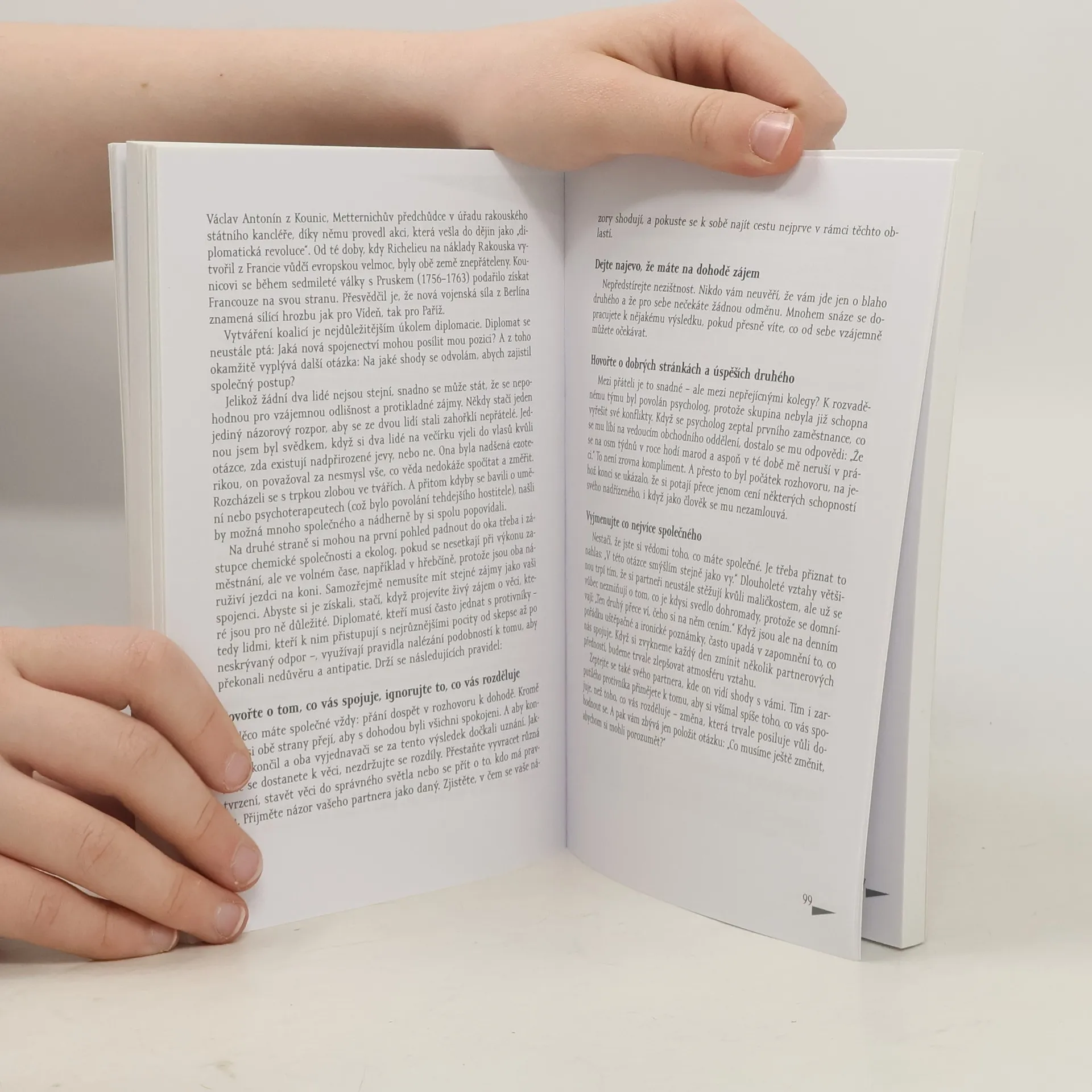 Jak prosadit svůj názor, záměr (a vlastně i sebe sama) hledáním pro obě strany přijatelných východisek a kompromisů a s respektem k partnerovi a jeho názorům. Dvacet zásad diplomatického chování ilustruje autor na příkladech z praxe. Velmi často se vrací do historie, k významných diplomatům a státníkům ( Talleyrand, Metternich, Richelieu, Churchill atd.).