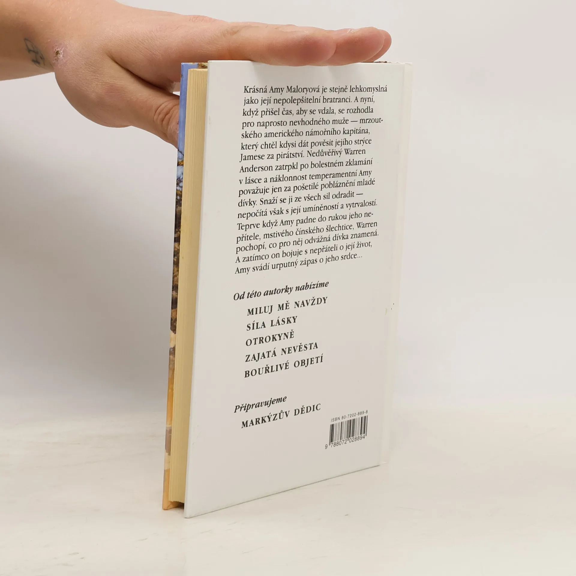 Krásná Amy Maloryová je stejně lehkomyslná jako její nepolepšitelní bratranci. A nyní, když přišel čas, aby se vdala, se rozhodla pro naprosto nevhodného muže – mrzoutského amerického námořního kapitána, který chtěl kdysi dát pověsit jejího strýce Jamese za pirátství. Nedůvěřivý Warren Anderson zatrpkl po bolestném zklamání v lásce a náklonnost temperamentní Amy považuje jen za pošetilé pobláznění mladé dívky. Snaží se ji ze všech sil odradit – nepočítá však s její umíněností a vytrvalostí. Teprve když Amy padne do rukou jeho nepřítele, mstivého čínského šlechtice, Warren pochopí, co pro něj odvážná dívka znamená. A zatímco on bojuje s nepřáteli o její život, Amy svádí urputný zápas o jeho srdce …