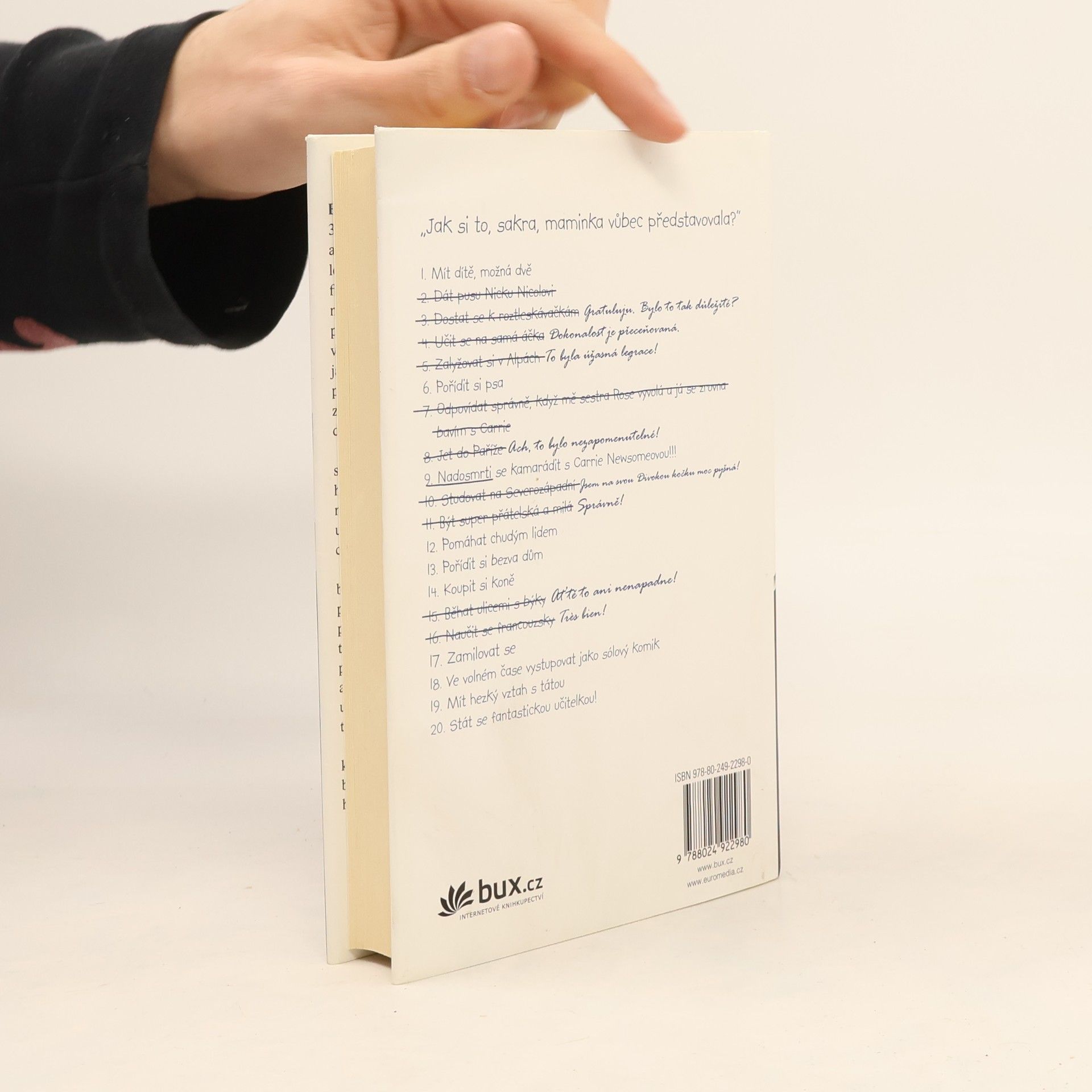 Brett Bohlingerová si až do svých 34 let žila jako princezna. Ze dne na den ale přichází o všechno, když zjišťuje, že milovaná maminka, majitelka obří kosmetické firmy, ji vynechala ze své závěti. Přesněji - její díl dědictví jí připadne pouze v případě, že dokáže do roka splnit všechna svá dětská přání, jejichž seznam si jako malá sepsala a na které už dávno zapomněla. Na rozdíl od matky. Jenomže proč by se měla Brett najednou stát učitelkou a ve volném čase dělat sólového komika, když se tak tvrdě připravovala na to, že jednou převezme rodinné impérium? A k čemu by jí byl kůň? Brett se cítí podvedená a ponížená, navíc přichází o práci, jistý příjem i dlouholetého přítele. S vidinou dědictví začíná plnit jeden bod seznamu za druhým a brzy si s překvapením uvědomuje, že jí ten starý ušmudlaný list papíru úplně ovládá. A že jí to vlastně vůbec nevadí … Půvabný románový debut americké autory o cestě za štěstím a o snech, jichž bych se člověk neměl nikdy vzdávat.
