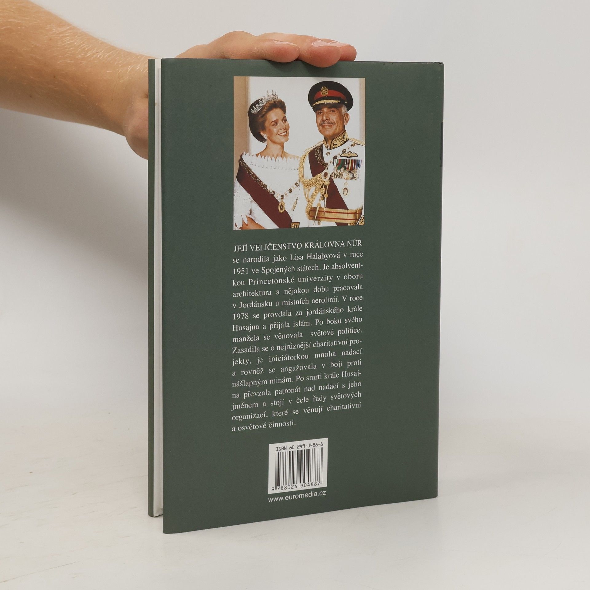 Její Veličenstvo královna Núr se narodila v r. 1951 v USA jako Lisa Halabyová. Je absolventkou Princetonské univerzity, nějakou dobu pracovala v Jordánsku u místních aerolinií.Tam se seznámila s jordánským králem Husajnem; setkání vedlo k téměř románovému vyústění: neznámá emancipovaná Američanka se v r. 1978 stala jordánskou královnou Núr al-Husajní a postupně matkou jeho čtyř dětí. Po boku manžela se věnovala světové politice, zasadila se za charitativní projekty, angažovala se v boji proti nášlapným minám. Po smrti krále převzala patronát nad nadací s jeho jménem a stojí v čele řady světových charitativních organizací. Ve svých pamětech se smyslem pro humor popisuje, jak musela překážky, které před ni kladlo nové společenské postavení. Její memoáry dávají nahlédnout do střeženého soukromí královské rodiny a přinášejí jedinečný portrét tohoto monarchy. Zároveň ukazují mentalitu arabského světa a dokumentují, jak stále víc narůstá neporozumění mezi USA a arabským světem.