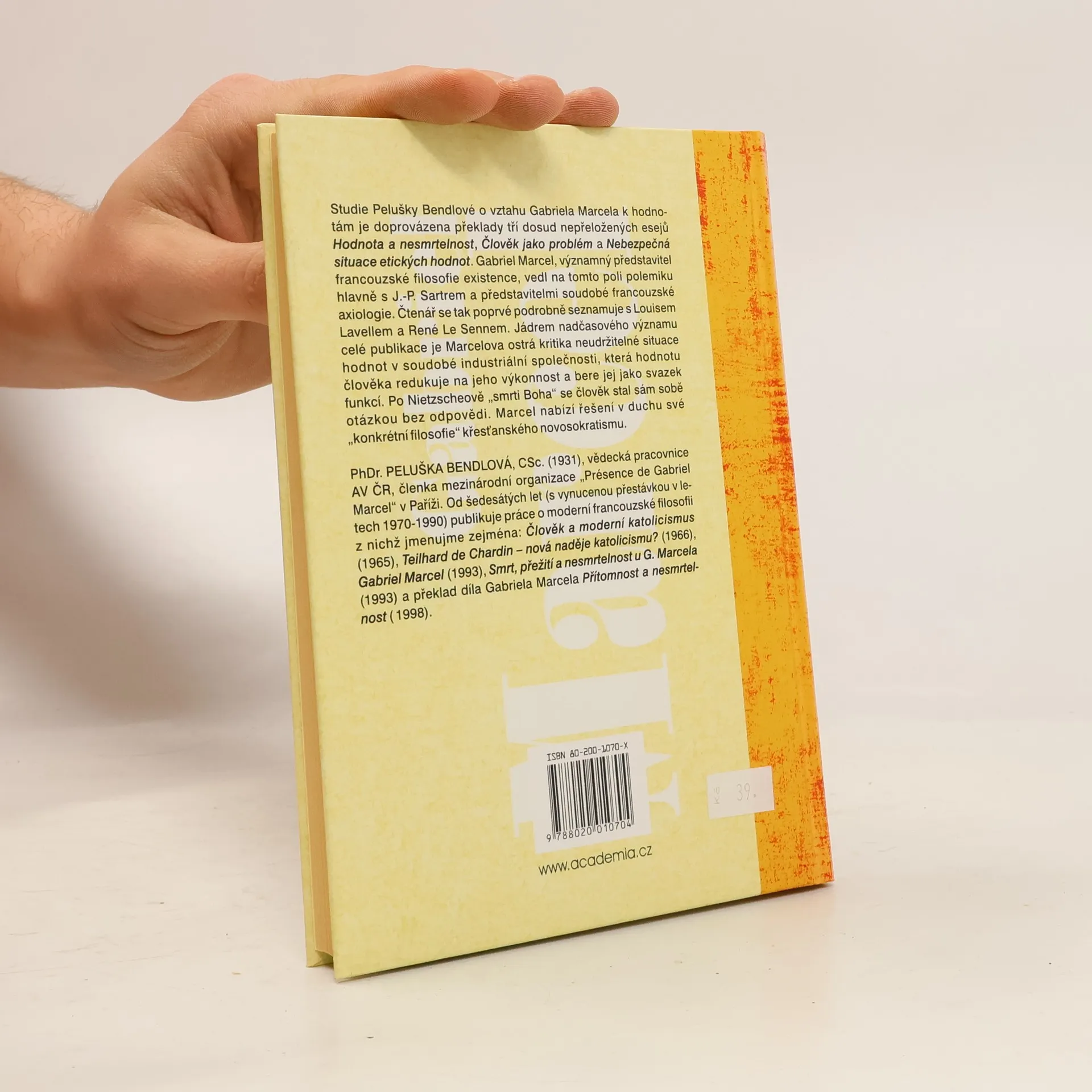 Studie P. Bendlové o vztahu Gabriela Marcela k hodnotám je doprovázena překlady tří dosud nepřeložených esejů Hodnota a nesmrtelnost, Člověk jako problém a Nebezpečná situace etických hodnot. Gabriel Marcel, významný představitel francouzské filosofie existence, vedl na tomto poli polemiku hlavně s J.-P. Sartrem a představiteli soudobé francouzské axiologie. Čtenář se tak poprvé podrobně seznamuje s Louisem Lavellem a Rané Le Sennem. Jádrem nadčasového významu celé publikace je Marcelova ostrá kritika neudržitelné situace hodnot v soudobé industriální společnosti, která hodnotu člověka redukuje na jeho výkonnost a bere jej jako svazek funkcí. Po Nietzscheově \"smrti Boha\" se člověk stal sám sobě otázkou bez odpovědi. Marcel nabízí řešení v duchu své \"konkrétní filosofie\" křesťanského novosokratismu.