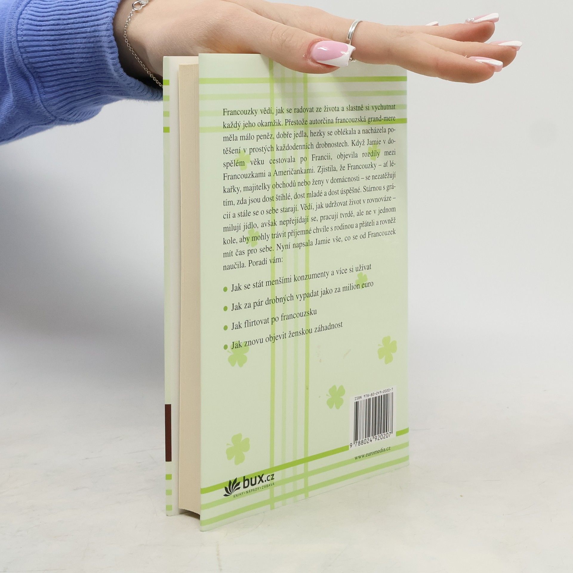 Francouzky vědí, jak se radovat ze života a slastně si vychutnat každý jeho okamžik. Když Jamie cestovala po Francii, zjistila, že Francouzky – ať lékařky, majitelky obchodů nebo ženy v domácnosti – se nezatěžují tím, zda jsou dost štíhlé, dost mladé a dost úspěšné. Stárnou s grácií a stále se o sebe starají. Vědí, jak udržovat život v rovnováze. Autorka vám s moudrostí i humorem poradí, jak se stát menšími konzumenty a více si užívat, jak za pár drobných vypadat jako za milion euro, jak flirtovat po francouzsku a znovu objevit ženskou záhadnost.
