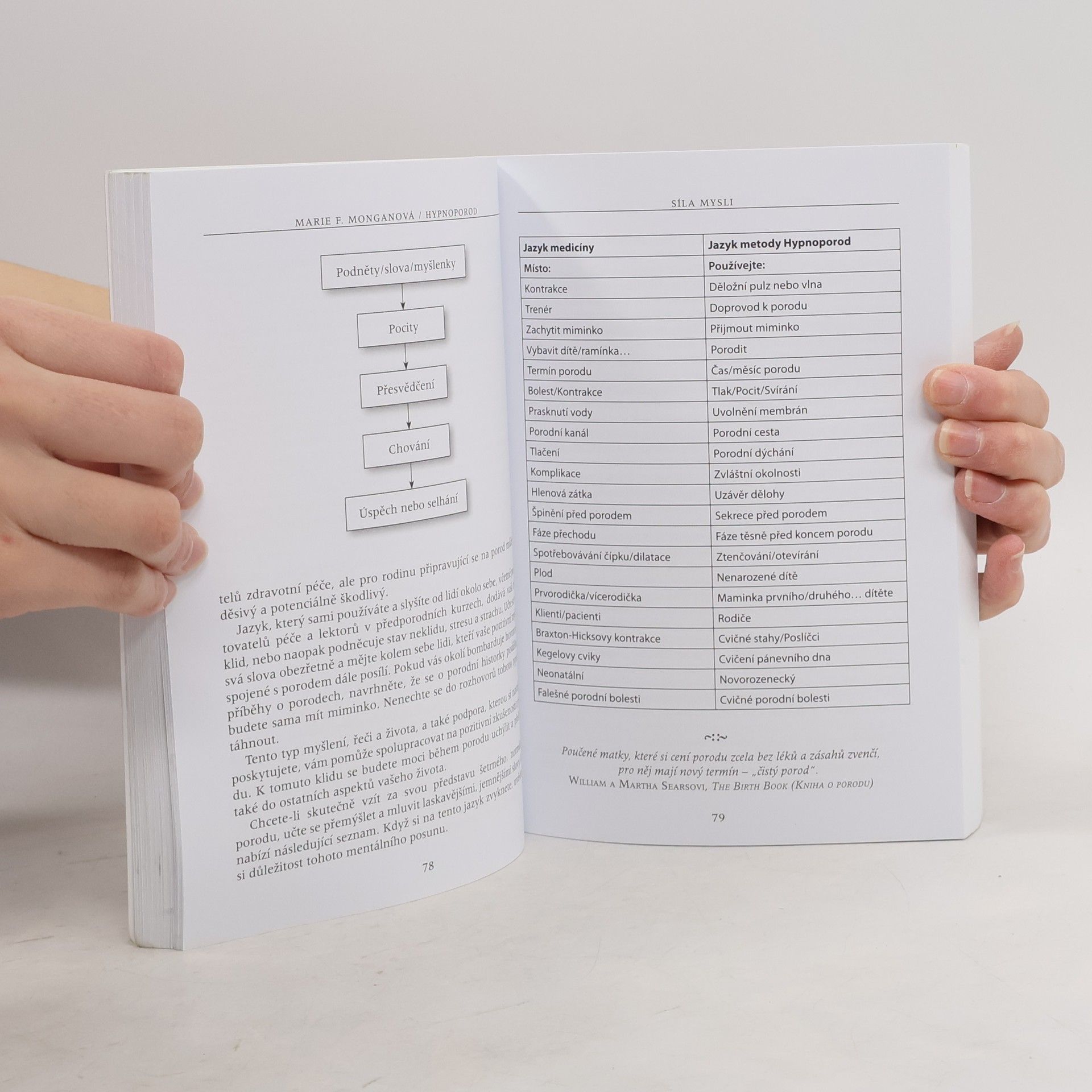 Česká republika patří k zemím, kde se většina žen porodu bojí. Často nemají jiné přání, než ho mít rychle za sebou. To první, co většinu dnešních žen v souvislosti s porodem napadá, je vědomí rizika a hrůza z bolesti. Autorka neprosazuje hypnoporody za přítomnosti odborného hypnotizéra, nýbrž vede každou jednu ženu ke schopnosti autohypnózy. Nejde tu o nic víc než o nejhlubší uvolnění, relaxaci, vnoření se do vlastního těla za současného odpojení racionálního vnímání, které umí spolehlivě zastavit jak orgasmus, tak spontánní porodní proces. Možná s autorkou nebudeme ve všem souhlasit, přesto připomíná podstatné. Těhotným a rodícím ženám skrytou moudrost a sílu jejich těl a těm, kdo o nastávající matky pečují, důležitost respektu a empatie.
