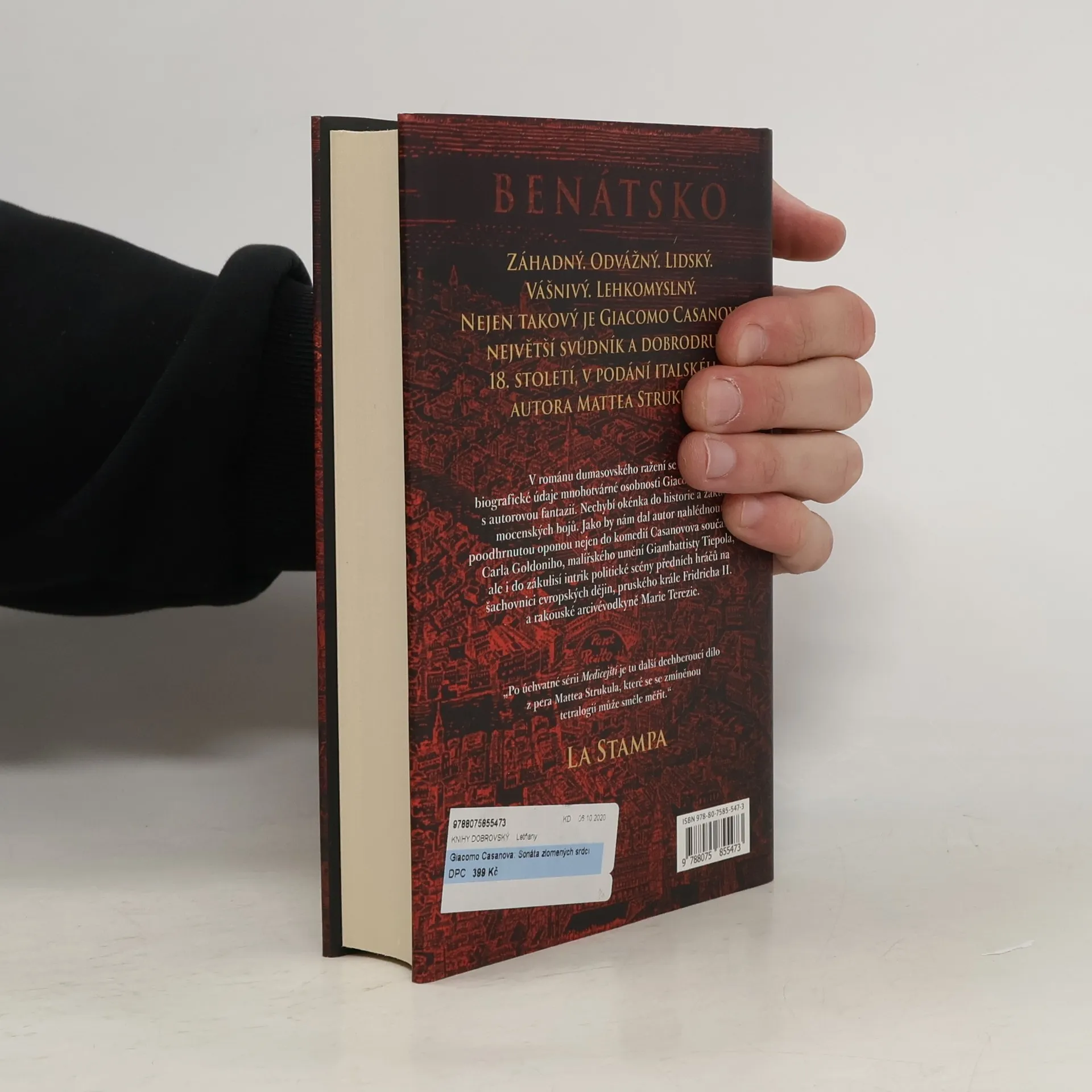 Záhadný, odvážný, lidský, vášnivý a lehkomyslný – takový je Giacomo Casanova, největší svůdník a dobrodruh 18. století, v podání italského autora Mattea Strukula. Dobrodružný román s milostnou zápletkou se odehrává v Benátkách, kde se prolínají karnevalová rozmarnost a historické události evropských bojišť. Strukulův jazyk je syrový a barvitý, přenáší čtenáře do atmosféry benátské laguny, vášní prosycených letních nocí a mrazivých soudních síní, včetně neblaze proslulého vězení Piombi. Biografie Giacoma Casanovy se mísí s autorovou fantazií a dumasovskými zápletkami. Čtenář nahlédne do historie mocenských bojů a do komedií Casanovova současníka Carla Goldoniho, stejně jako do umění Giambattisty Tiepola a intrik politické scény. V létě 1755 se Casanova vrací do Benátek, kde se setkává s černým inkvizitorem Garzoni, který ho nenávidí a obdivuje zároveň. Garzoni plánuje Casanovu zničit, zatímco se o moc ucházejí přední benátské rody. Do hry vstupují i tajemné postavy, jako hraběnka Margarethe von Steinberg a rebelka Francesca Erizzo. Která z žen nakonec získá Giacomovo srdce a která z nich se stane začátkem jeho konce?