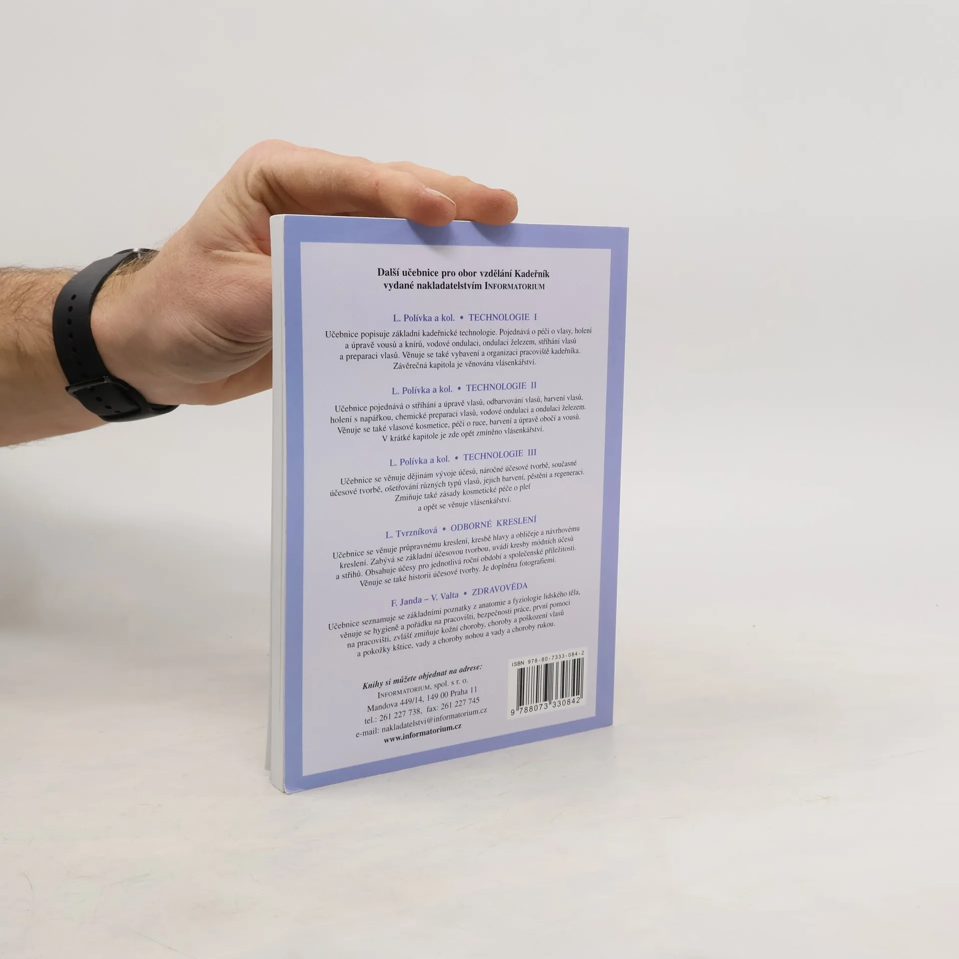 Popisuje stavbu, základní funkce a vlastnosti vlasů a kůže. Seznamuje s materiály používanými v kadeřnické praxi a s jejich fyzikálním i chemickým působením na vlasy a pokožku. Dostatečné množství názorného materiálu pomůže studentům osvojit si látku, která předpokládá určité znalosti chemie a technologie.