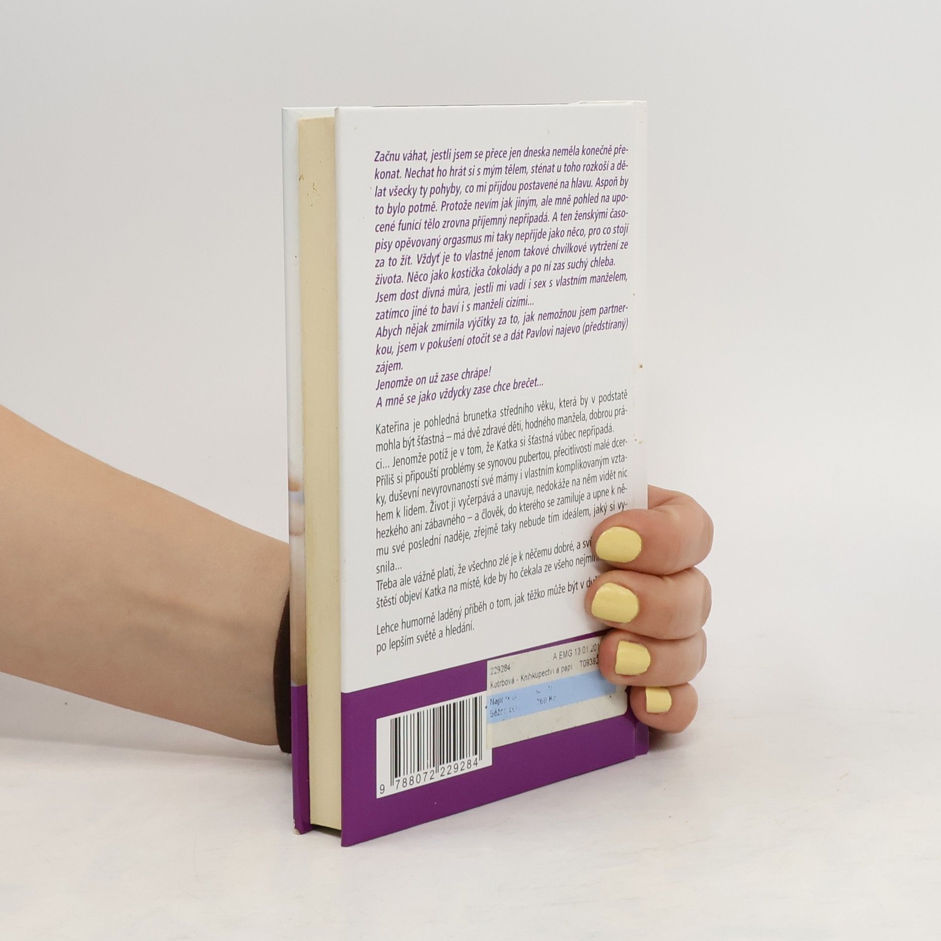 Kateřina je pohledná brunetka středního věku, která by v podstatě mohla být šťastná – má dvě zdravé děti, hodného manžela, dobrou práci... Jenomže potíž je v tom, že Katka si šťastná vůbec nepřipadá. Příliš si připouští problémy se synovou pubertou, přecitlivostí malé dcerky, duševní nevyrovnaností své mámy i vlastním komplikovaným vztahem k lidem. Život ji vyčerpává a unavuje, nedokáže na něm vidět nic hezkého ani zábavného – a člověk, do kterého se zamiluje a upne k němu své poslední naděje, zřejmě taky nebude tím ideálem, jaký si vysnila... Třeba ale vážně platí, že všechno zlé je k něčemu dobré, a svůj recept na štěstí objeví Katka na místě, kde by ho čekala ze všeho nejmíň... Lehce humorně laděný příběh o tom, jak těžko může být v duši, o touze po lepším světě a hledání.