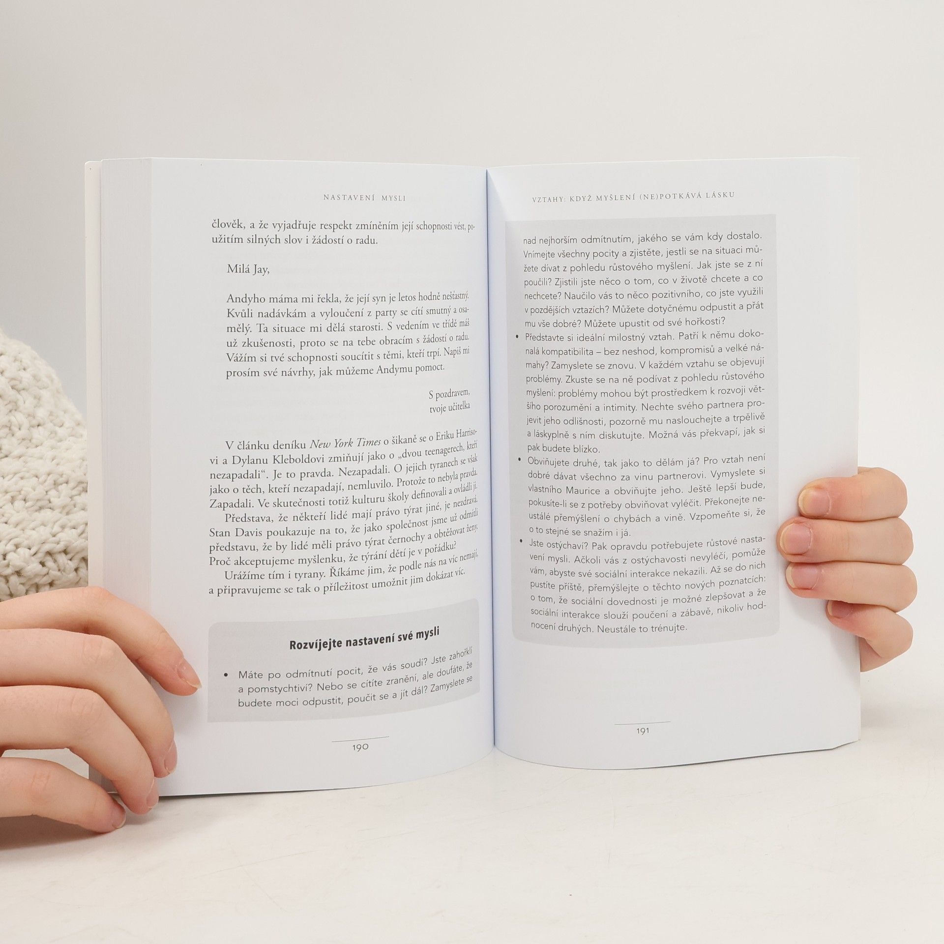 Jednoduchá myšlenka, kolem níž se tato kniha točí, a za níž stojí desítky let vědeckého výzkumu, se dá vyjádřit zhruba takto: úspěch máme ve svých hlavách. Profesorka Dwecková se svým týmem na Standfordské univerzitě zjistila, že svou přirozeností tíhneme ke dvěma relativně vyhraněným způsobům myšlení o sobě a své úspěšnosti: k myšlení růstovému a myšlení fixnímu (angl. „growth mindset“ a „fixed mindset“). To, které myšlení u nás převládá, pak významně ovlivňuje naši reálnou úspěšnost. Ke zjištěním Dweckové popsaným v knize patří nadějný závěr, že se navzdory své dispozici dokážeme během života změnit, a autorka ukazuje, jak na to: jak využít svůj plný potenciál. Chcete vědět, jak přesně se dva zmíněné typy myšlení projevují? Typickým rysem fixního myšlení je vzdávání se před překážkou, neschopnost přijímat zpětnou vazbu, špatný pocit při vnímání úspěchu ostatních, vyhýbání se výzvám a negativní postoj k úsilí jako takovému. Naopak růstové myšlení se projevuje vřelým vztahem k výzvám, vytrvalostí při čelení překážkám, pozitivním vztahem ke kritice. Růstově myslící člověk vnímá úsilí jako cestu k mistrovství a v úspěchu druhých vidí inspiraci.