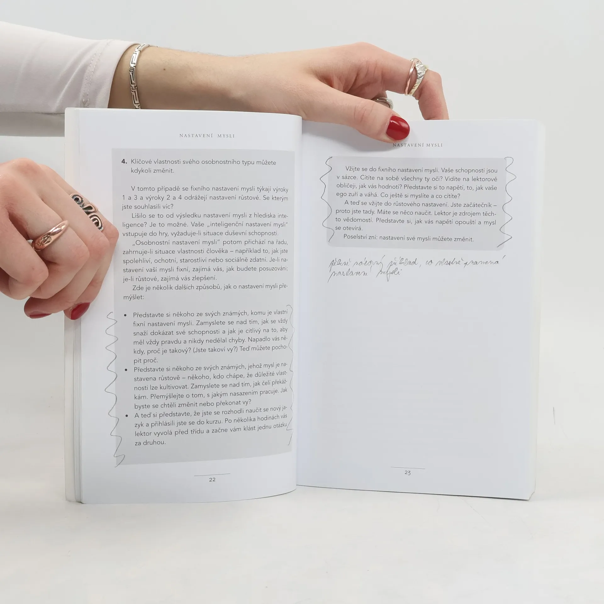 Jednoduchá myšlenka, kolem níž se tato kniha točí, a za níž stojí desítky let vědeckého výzkumu, se dá vyjádřit zhruba takto: úspěch máme ve svých hlavách. Profesorka Dwecková se svým týmem na Standfordské univerzitě zjistila, že svou přirozeností tíhneme ke dvěma relativně vyhraněným způsobům myšlení o sobě a své úspěšnosti: k myšlení růstovému a myšlení fixnímu (angl. „growth mindset“ a „fixed mindset“). To, které myšlení u nás převládá, pak významně ovlivňuje naši reálnou úspěšnost. Ke zjištěním Dweckové popsaným v knize patří nadějný závěr, že se navzdory své dispozici dokážeme během života změnit, a autorka ukazuje, jak na to: jak využít svůj plný potenciál. Chcete vědět, jak přesně se dva zmíněné typy myšlení projevují? Typickým rysem fixního myšlení je vzdávání se před překážkou, neschopnost přijímat zpětnou vazbu, špatný pocit při vnímání úspěchu ostatních, vyhýbání se výzvám a negativní postoj k úsilí jako takovému. Naopak růstové myšlení se projevuje vřelým vztahem k výzvám, vytrvalostí při čelení překážkám, pozitivním vztahem ke kritice. Růstově myslící člověk vnímá úsilí jako cestu k mistrovství a v úspěchu druhých vidí inspiraci.
