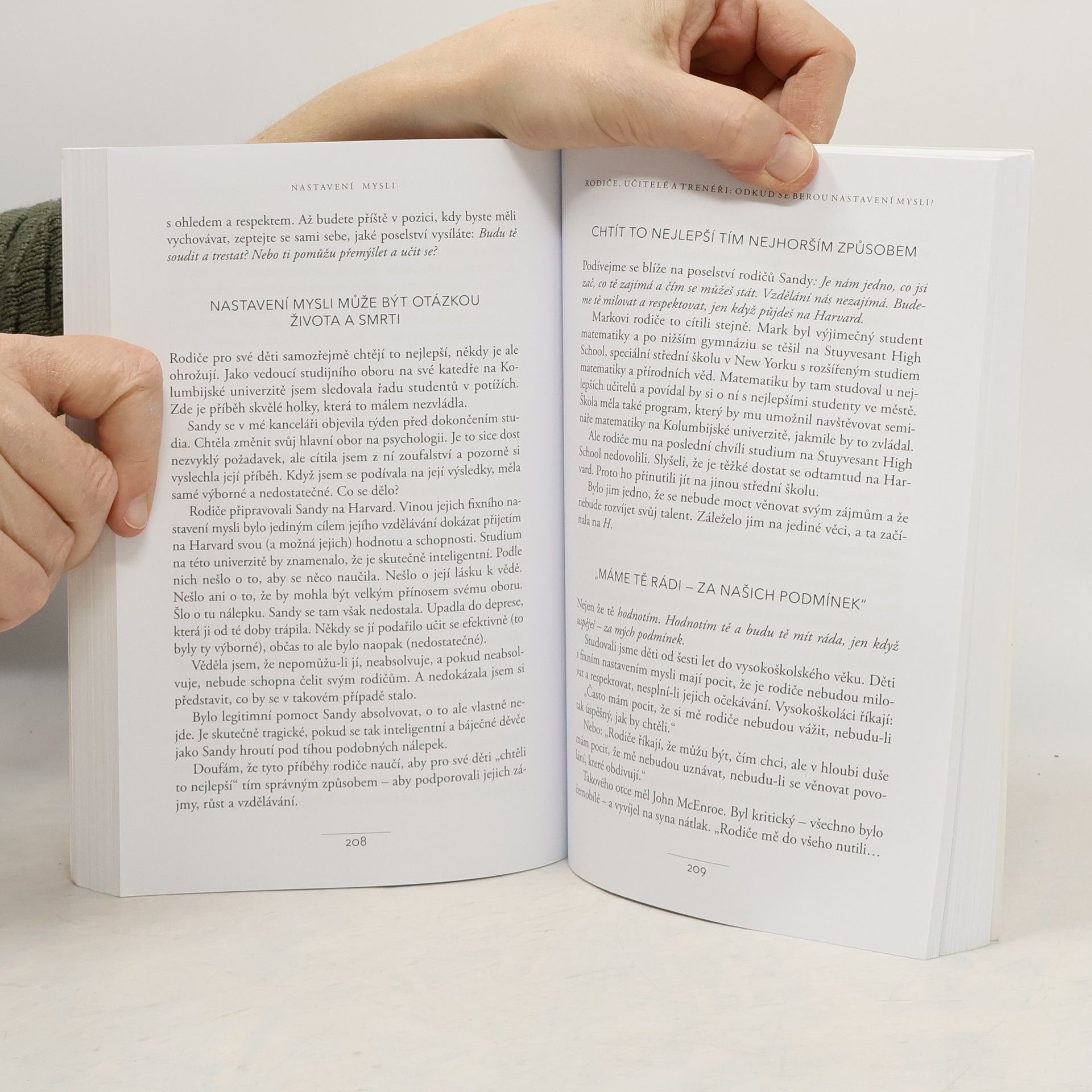 Jednoduchá myšlenka, kolem níž se tato kniha točí, a za níž stojí desítky let vědeckého výzkumu, se dá vyjádřit zhruba takto: úspěch máme ve svých hlavách. Profesorka Dwecková se svým týmem na Standfordské univerzitě zjistila, že svou přirozeností tíhneme ke dvěma relativně vyhraněným způsobům myšlení o sobě a své úspěšnosti: k myšlení růstovému a myšlení fixnímu (angl. „growth mindset“ a „fixed mindset“). To, které myšlení u nás převládá, pak významně ovlivňuje naši reálnou úspěšnost. Ke zjištěním Dweckové popsaným v knize patří nadějný závěr, že se navzdory své dispozici dokážeme během života změnit, a autorka ukazuje, jak na to: jak využít svůj plný potenciál. Chcete vědět, jak přesně se dva zmíněné typy myšlení projevují? Typickým rysem fixního myšlení je vzdávání se před překážkou, neschopnost přijímat zpětnou vazbu, špatný pocit při vnímání úspěchu ostatních, vyhýbání se výzvám a negativní postoj k úsilí jako takovému. Naopak růstové myšlení se projevuje vřelým vztahem k výzvám, vytrvalostí při čelení překážkám, pozitivním vztahem ke kritice. Růstově myslící člověk vnímá úsilí jako cestu k mistrovství a v úspěchu druhých vidí inspiraci.