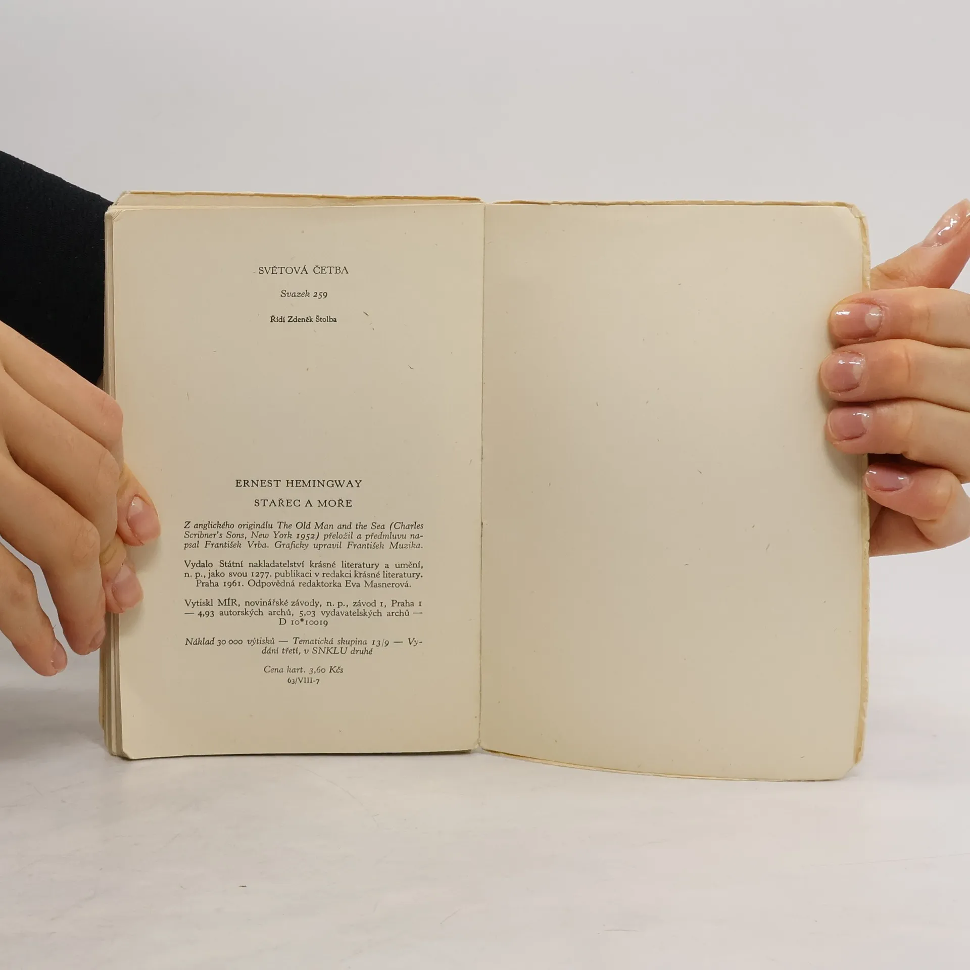 Snad nejznámější novela autora, který ovlivnil celou generaci amerických i evropských prozaiků. Byla napsána r. 1952 a objevila se i ve filmové podobě. Příběh bezejmenného starce, jenž bojuje na širém moři o svůj úlovek a později už jen o holý život, symbolizuje odvěký zápas člověkas přírodou, zápas, který vyplňuje lidský život. Spisovateli byla za toto dílo udělena Nobelova cena. Edice: Světová četba ; sv. 259 30000 výt. 3. vydání, v SNKLHU 2. vydání.