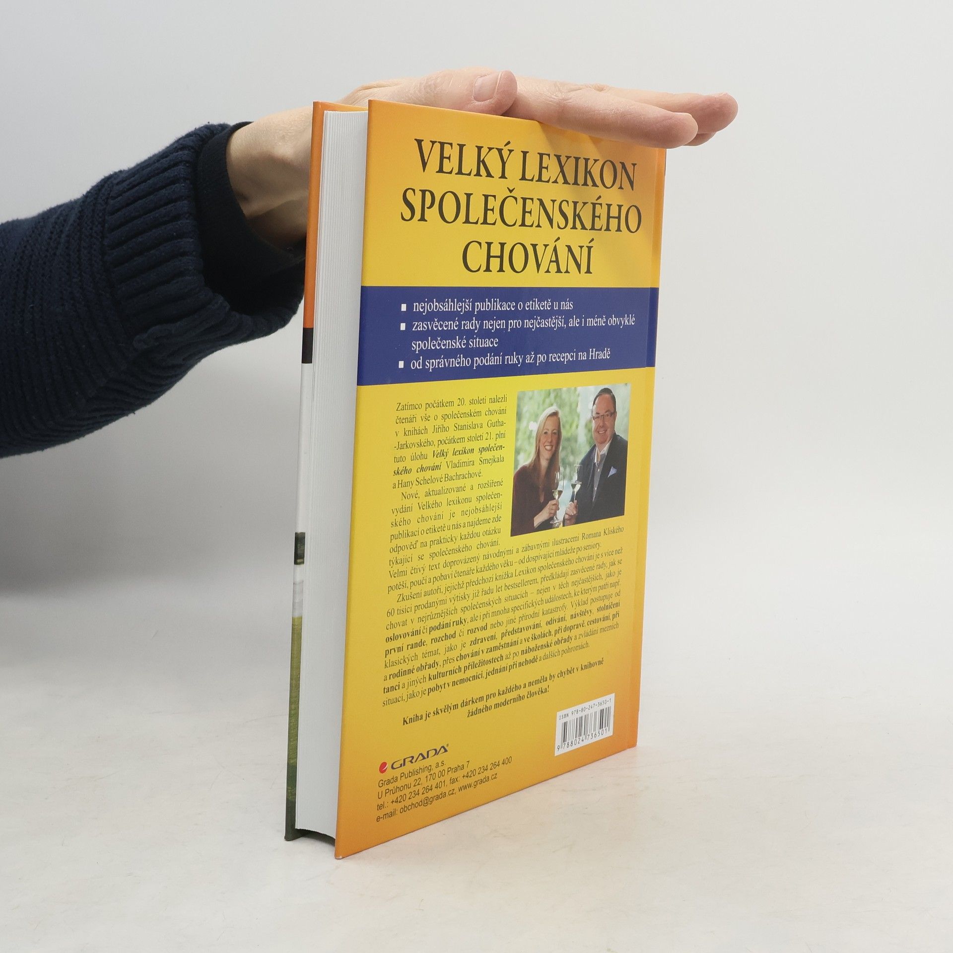 Zatímco počátkem 20. století nalezli čtenáři vše o společenském chování v knihách Jiřího Stanislava Gutha-Jarkovského, počátkem století 21. plní tuto úlohu Velký lexikon společenského chování Vladimíra Smejkala a Hany Schelové Bachrachové. Nové, rozšířené vydání Velkého lexikonu společenského chování je nejobsáhlejší publikací o etiketě u nás a najdeme zde odpověď na prakticky každou otázku týkající se společenského chování. Velmi čtivý text doprovázený návodnými a zábavnými ilustracemi Romana Kliského potěší, poučí a pobaví čtenáře každého věku - od dospívající mládeže po seniory. Zkušení autoři, jejichž předchozí knížka Lexikon společenského chování je s více než 60 tisíci prodanými výtisky již řadu let bestsellerem, předkládají zasvěcené rady, jak se chovat v nejrůznějších společenských situacích - nejen v těch nejčastějších, jako je oslovování či podání ruky, ale i při mnoha specifických událostech, ke kterým patří např. první rande, rozchod či rozvod nebo jiné přírodní katastrofy. Výklad postupuje od klasických témat, jako je zdravení, představování, odívání, návštěvy, stolničení a rodinné obřady, přes chování v zaměstnání a ve školách, při dopravě, cestování, při tanci a jiných kulturních příležitostech až po náboženské obřady a zvládání mezních situací, jako je pobyt v nemocnici, jednání při nehodě a dalších pohromách. Kniha je skvělým dárkem pro každého a neměla by chybět v knihovně žádného moderního člověka!