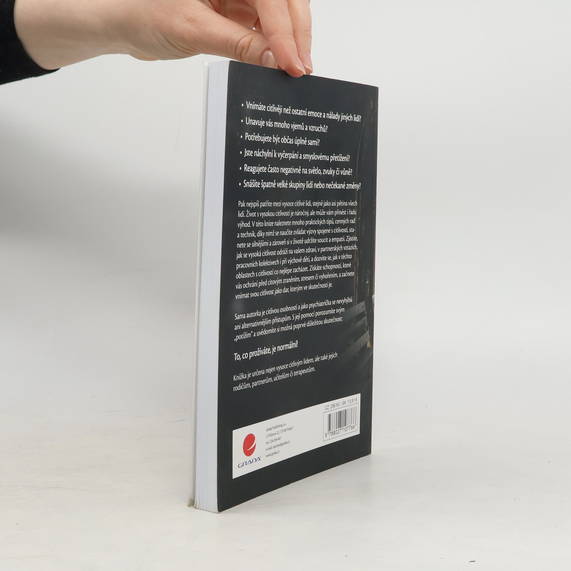 Vnímáte citlivěji než ostatní emoce a nálady jiných lidí? Unavuje vás mnoho vjemů a vzruchů? Potřebujete být občas úplně sami? Jste náchylní k vyčerpání a smyslovému přetížení? Reagujete často negativně na světlo, zvuky či vůně? Snášíte špatně velké skupiny lidí nebo nečekané změny? Pak nejspíš patříte mezi vysoce citlivé lidi, stejně jako asi pětina všech lidí. Život s vysokou citlivostí je náročný, ale může vám přinést i řadu výhod. V této knize naleznete mnoho praktických tipů, cenných rad a technik, díky nimž se naučíte zvládat výzvy spojené s citlivostí, stanete se silnějšími a zároveň si v životě udržíte soucit a empatii. Zjistíte, jak se vysoká citlivost odráží na vašem zdraví, v partnerských vztazích, pracovních kolektivech i při výchově dětí, a dozvíte se, jak v těchto oblastech s citlivostí co nejlépe zacházet. Získáte schopnosti, které vás ochrání před citovým zraněním, stresem či vyhořením, a začnete vnímat svou citlivost jako dar, kterým ve skutečnosti je. Sama autorka je citlivou osobností a jako psychiatrička se nevyhýbá ani alternativnějším přístupům. S její pomocí porozumíte svým „potížím“ a uvědomíte si možná poprvé důležitou skutečnost: To, co prožíváte, je normální! Knížka je určena nejen vysoce citlivým lidem, ale také jejich rodičům, partnerům, učitelům či terapeutům.