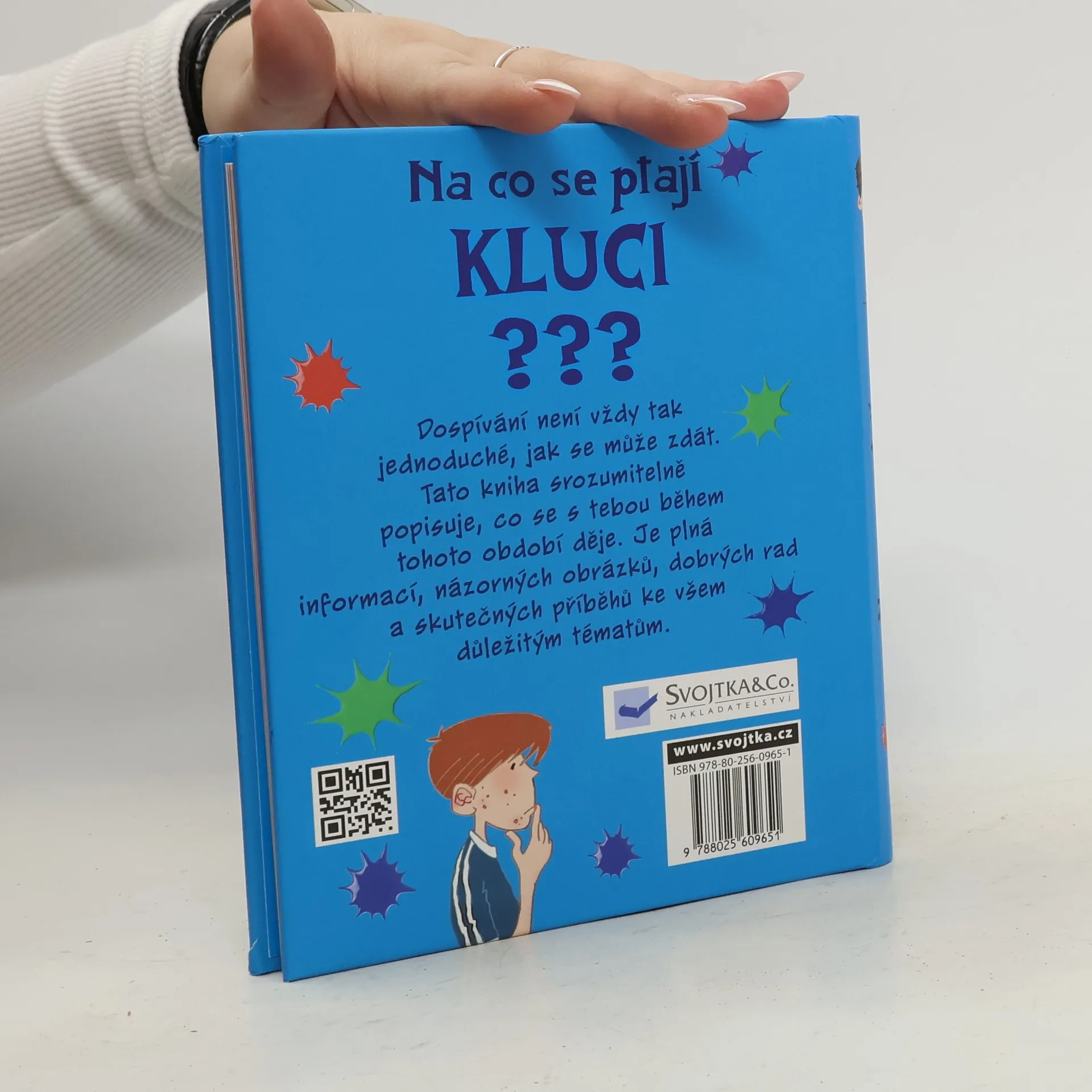 Dospívání není vždy tak jednoduché, jak by se mohlo zdát. Na co se ptají kluci? Tato kniha jednoduše a srozumitelně popisuje, co se s tebou během tohoto nelehkého období děje. Je plná informací, názorných obrázku, dobrých rad týkajících se všech důležitých témat i historek ze života. Můžeš ji přečíst od začátku do konce nebo si vybrat jen ty části, které tě právě zajímají. Leccos z toho ti muže připadat složité, něco dokonce trapné, něco naopak úsměvné, možná budeš mít z něčeho obavy. Ale až se vším "prokoušeš", budeš mít určitě dobrou představu o tom, co tě čeká a co se to s tebou vlastně děje. Kromě toho zde najdeš pár skvělých rad, díky nimž se dokážeš vyhnout mnoha trapným situacím.