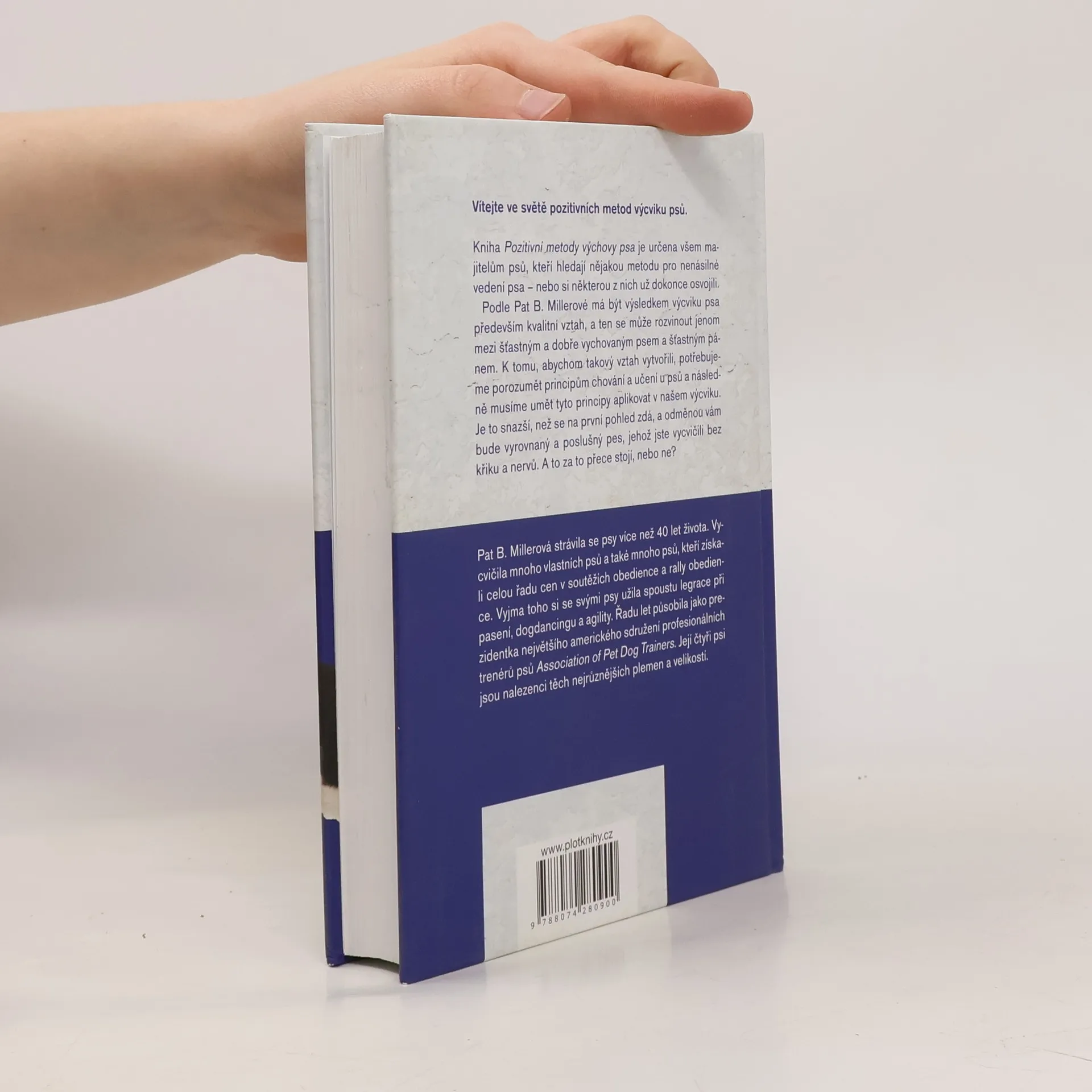 Vítejte ve světě pozitivních metod výcviku psů. Kniha je určena všem majitelům psů, kteří hledají nějakou metodu pro nenásilné vedení psa – nebo si některou z nich už dokonce osvojili. Podle Pat B. Millerové má být výsledkem výcviku psa především kvalitní vztah, a ten se může rozvinout jenom mezi šťastným a dobře vychovaným psem a šťastným pánem. K tomu, abychom takový vztah vytvořili, potřebujeme porozumět principům chování a učení u psů a následně musíme umět tyto principy aplikovat v našem výcviku. Je to snazší, než se na první pohled zdá, a odměnou vám bude vyrovnaný a poslušný pes, jehož jste vycvičili bez křiku a nervů. A to za to přece stojí, nebo ne? Pat B. Millerová strávila se psy více než 40 let života. Vycvičila mnoho vlastních psů a také mnoho psů, kteří získali celou řadu cen v soutěžích obedience a rally obedience. Vyjma toho si se svými psy užila spoustu legrace při pasení, dogdancingu a agility. Řadu let působila jako prezidentka největšího amerického sdružení profesionálních trenérů psů Association of Pet Dog Trainers. Její čtyři psi jsou nalezenci těch nejrůznějších plemen a velikostí.