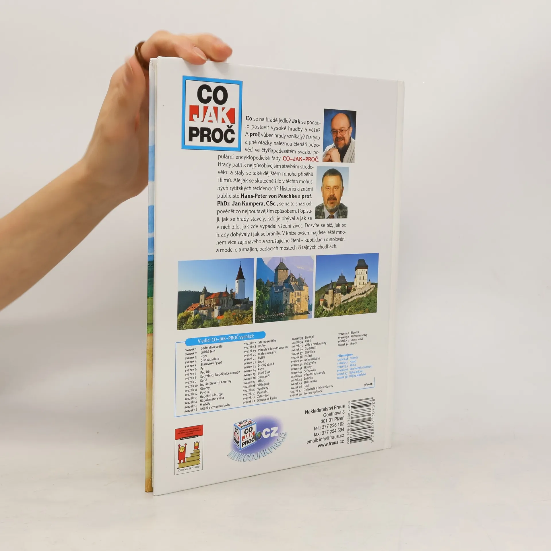 Co se na hradě jedlo? Jak se podařilo postavit vysoké hradby a věže? A proč vůbec hrady vznikaly? Na tyto a jiné otázky naleznou čtenáři odpověď ve čtyřiapadesátém svazku populární encyklopedické řady CO-JAK-PROČ. Hrady patří k nejpůsobivějším stavbám středověku a staly se také dějištěm mnoha příběhů i filmů. Ale jak se skutečně žilo v těchto mohutných rytířských rezidencích? Historici a známí publicisté Hans-Peter Jeschke a prof. PhDr. Jan Kumpera, CSc., se na to snaží dpovědět co nejpoutavějším způsobem. Popisují, jak se hrady stavěly, kdo je obýval a jak se v nich žilo, jak zde vypadal všední život. Dozvíte se též, jak se hrady obývaly i jak se bránily. V knize ovšem najdete ještě mnohem více zajímavého a vzrušujícího čtení - kupříkladu o stolování amódě, o turnajích, padacích mostech či tajných chodbách.