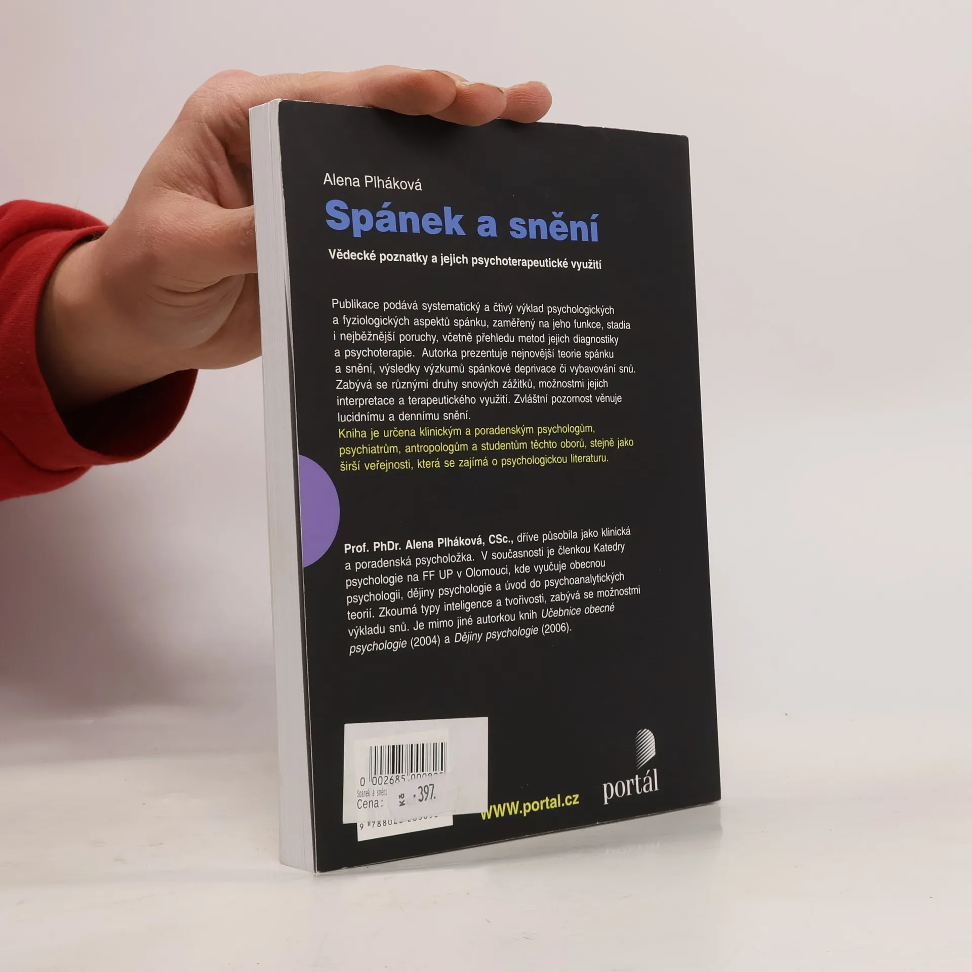 Vědecké poznatky a jejich psychoterapeutické využití / Publikace podává systematický a čtivý výklad psychologických a fyziologických aspektů spánku, zaměřený na jeho funkce, stadia i nejběžnější poruchy, včetně přehledu metod jejich diagnostiky a psychoterapie. Autorka prezentuje nejnovější teorie spánku a snění, výsledky výzkumů spánkové deprivace či vybavování snů. Zabývá se různými druhy snových zážitků, možnostmi jejich interpretace a terapeutického využití. Zvláštní pozornost je věnována lucidnímu a dennímu snění. Kniha je určena klinickým a poradenským psychologům, psychiatrům, antropologům a studentům těchto oborů, stejně jako širší veřejnosti, která se zajímá o psychologickou literaturu. Může pomoci při přípravě ke studiu psychologie. Prof. PhDr. Alena Plháková, CSc., dříve působila jako klinická a poradenská psycholožka. V současnosti je členkou Katedry psychologie na FF UP v Olomouci, kde vyučuje obecnou psychologii, dějiny psychologie a úvod do psychoanalytických teorií. Zkoumá typy inteligence a tvořivosti, zabývá se možnostmi výkladu snů. Je mimo jiné autorkou knih Učebnice obecné psychologie (2004) a Dějiny psychologie (2006).