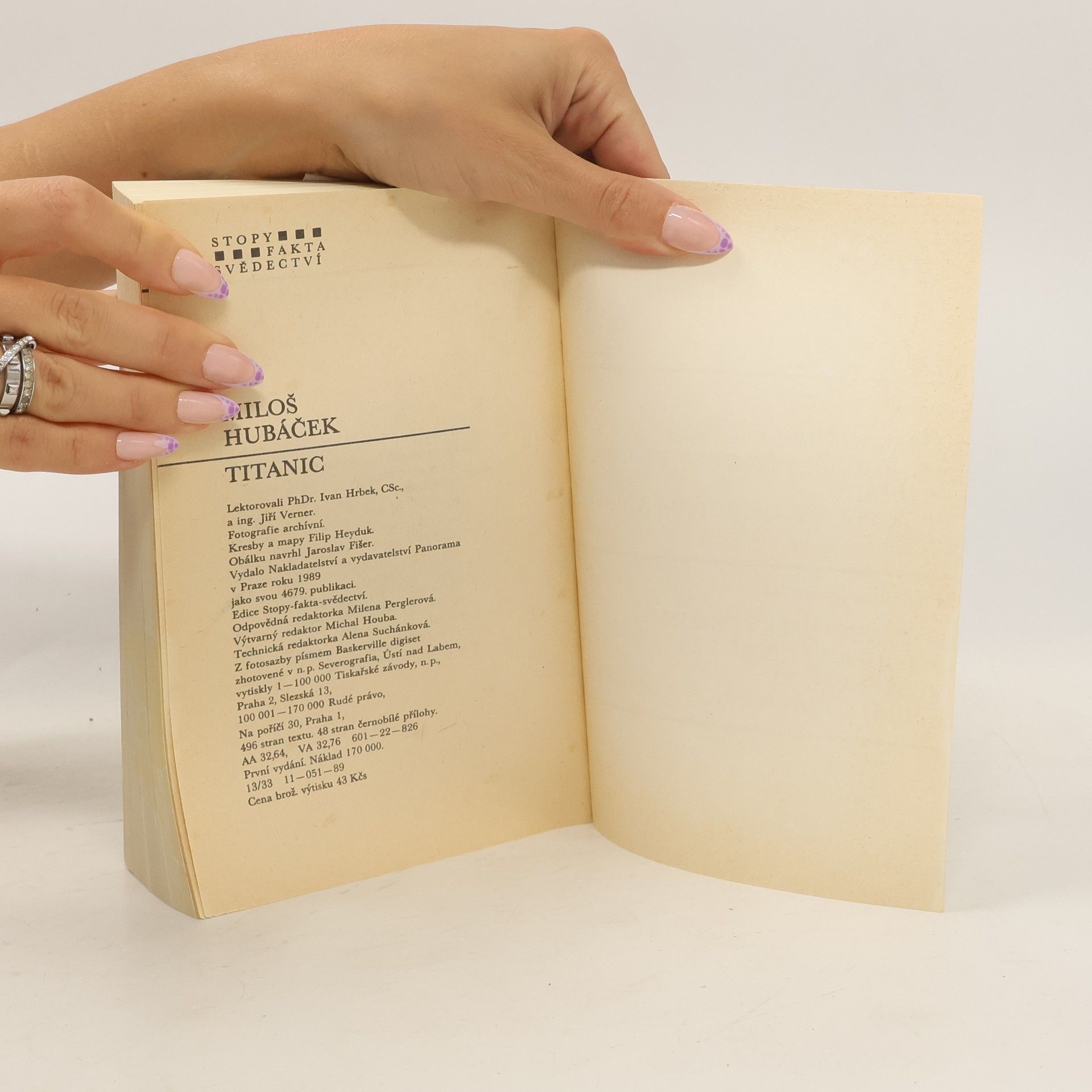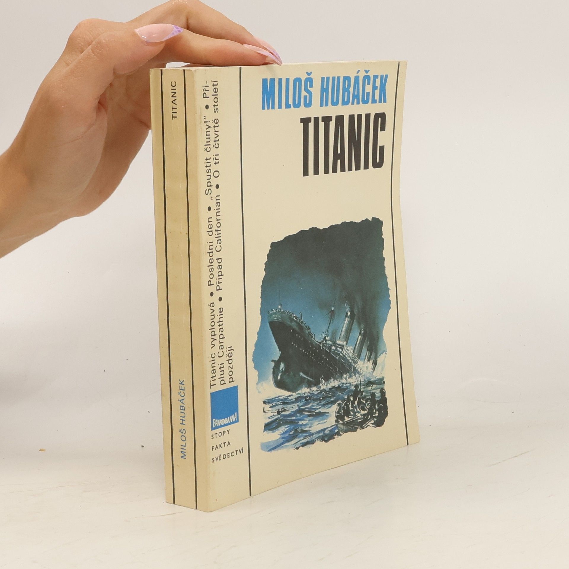 Titanic byl největší lodí světa své doby, měl to být triumf lidského génia a průmyslového věku. Byl též výrazem soupeření transoceánských společností, které se předháněly ve svých nabídkách. Loď dlouhá téměř 260 metrů měla pojmout až tři tisíce pasažerů, bylo to něco dosudnevídaného. 10. dubna 1912 vyplul ze Southamptonu na pravidelné lince do New Yorku, aby se představil v plné kráse všem lidem i mořským vlnám. Nikdo s nadšených a řádně hrdých pasažérů a členů posádky netušil, že je to také jeho poslední plavba. Co se odehrávalo na palubě, v podpalubích, na kapitánském můstku během oněch osudových chvil? 1. vydání. Edice: Stopy, fakta, svědectví Kresby a mp. Filip Heyduk. Obálka Jaroslav Fišer.