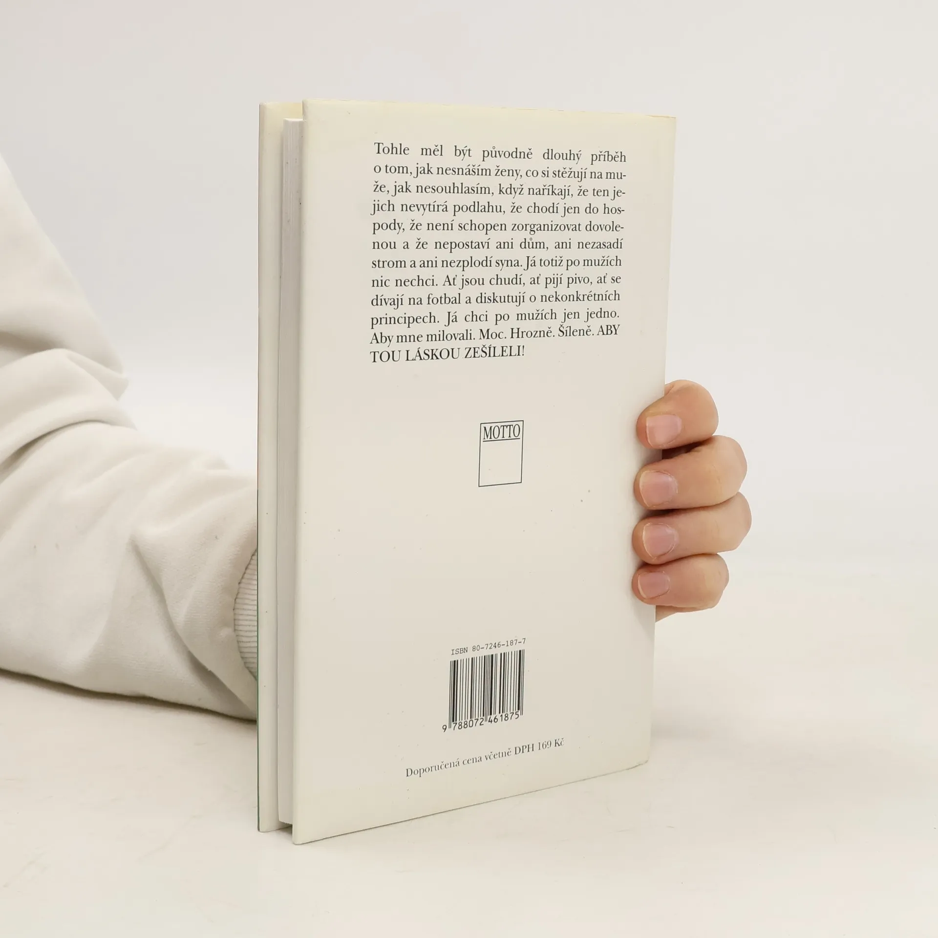 Populární sbírka fejetonů na věčné téma. Osobité postřehy dokáže autorka líčit s neopakovatelným vtipem a ironií. Tohle měl být původně dlouhý příběh o tom, jak nesnáším ženy, co si stěžují na muže, jak nesouhlasím, když naříkají, že ten jejich nevytírá podlahu, že chodí jen do hospody, že není schopen zorganizovat dovolenou a že nepostaví ani dům, ani nezasadí strom a ani nezplodí syna. Já totiž po mužích nic nechci. Ať jsou chudí, ať pijí pivo, ať se dívají na fotbal a diskutují o nekonkrétních principech. Já chci po mužích jen jedno. Aby mne milovali. Moc. Hrozně. Šíleně. ABY TOU LÁSKOU ZEŠÍLELI!