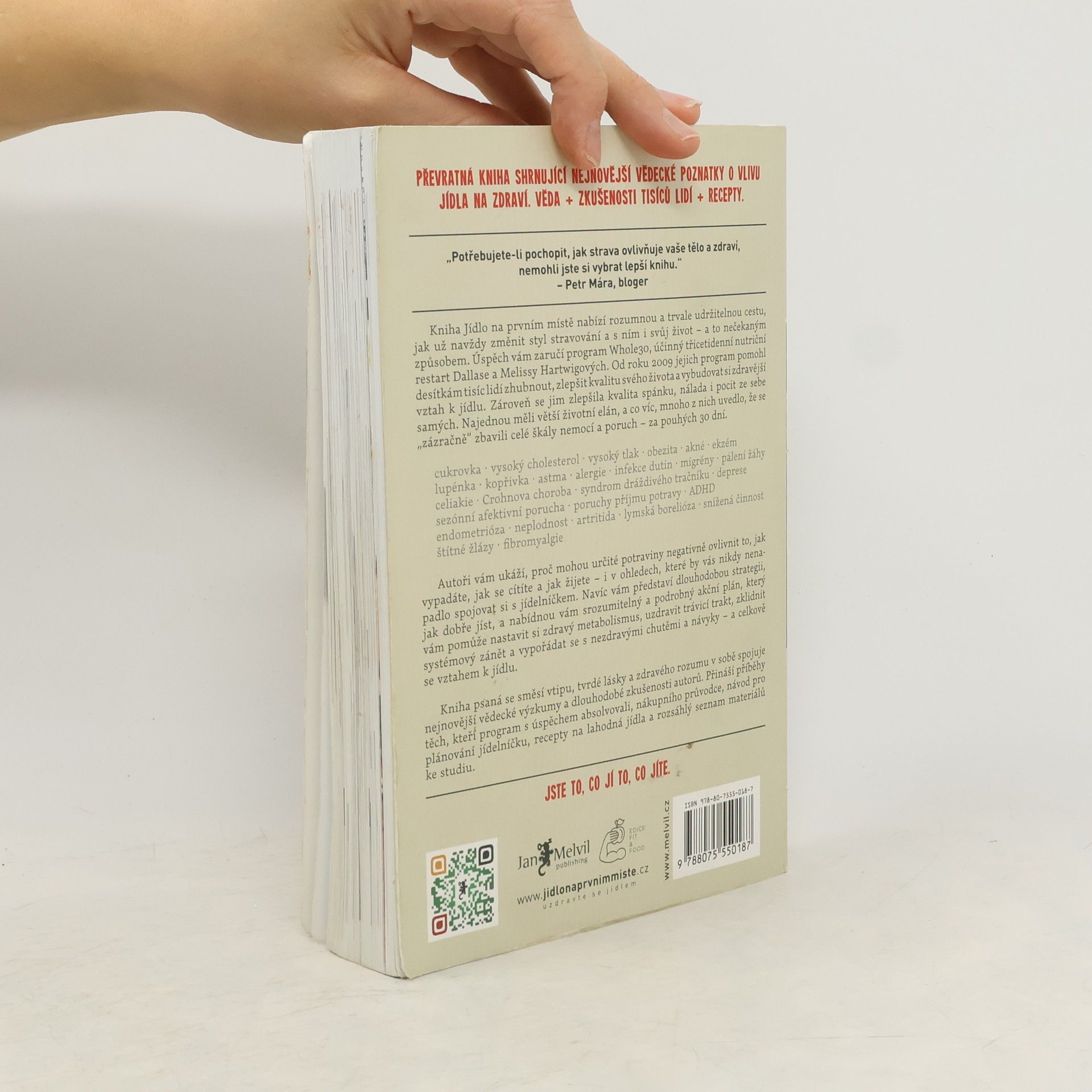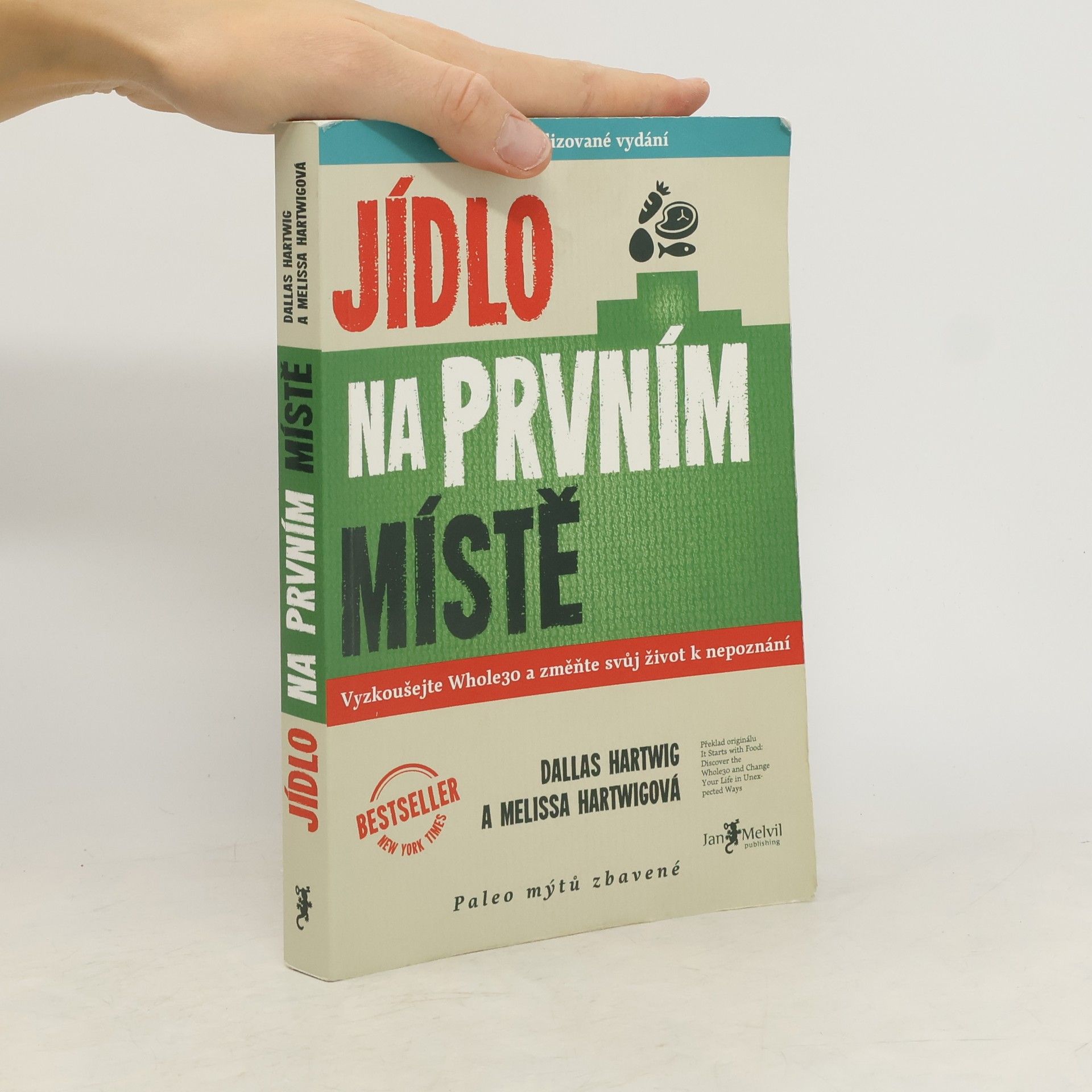 Jídlo na prvním místě není řadová kniha o paleodietě, tohle je Melvilem pečlivě zvolený vstupní titul nabízející skutečnou životní změnu. Že nemáte tušení, co to je paleodieta? Všichni víme, že jídlo ovlivňuje kvalitu našeho života – ale jak velkou moc vlastně má? Melissa a Dallas vás přesvědčí, že mimořádnou! Jídlo na prvním místě je přehledný, čtivý a srozumitelný návod, díky kterému konečně pochopíte vzájemné reakce inzulínu, leptinu, kortizolu a glukagonu. Autoři vám na podkladě vědeckých výzkumů vysvětlí fakt, proč sacharidy v naší stravě nejsou tím nejpříznivějším palivem a že paleodieta je nejlepší způsob, jak je nahradit. Autoři tvrdí, že už během 30 dnů po změně stravovacího plánu sestaveného podle jejich instrukcí dochází ke zlepšení stavu mnoha chronických, obtížně léčitelných onemocnění, jako jsou cukrovka, lupénka, Crohnova choroba, endometriáza, ekzémy a dalších. Množství receptů a tipů je doplněno vysvětlením, co jak na jednotlivá jídla reaguje naše tělo. Sympatičtí autoři vás postupně a s humorem převedou k zdravým návykům, díky nimž dochází ke zlepšení stavu celého těla, hormonální rovnováze, ústupu zažívacích obtíží a redukci zánětlivých procesů. Hartwigovi jsou tvrďáci. 30 dní jejich kůry je velmi náročný měsíc, ale jak sami říkají, je to pro vaše dobro: "Neodvažujte se namítat, že je to těžké. Skoncovat s heroinem je těžké. Porazit rakovinu je těžké. Pít kávu bez mléka NENÍ TĚŽKÉ!" 2. aktualizované vydání