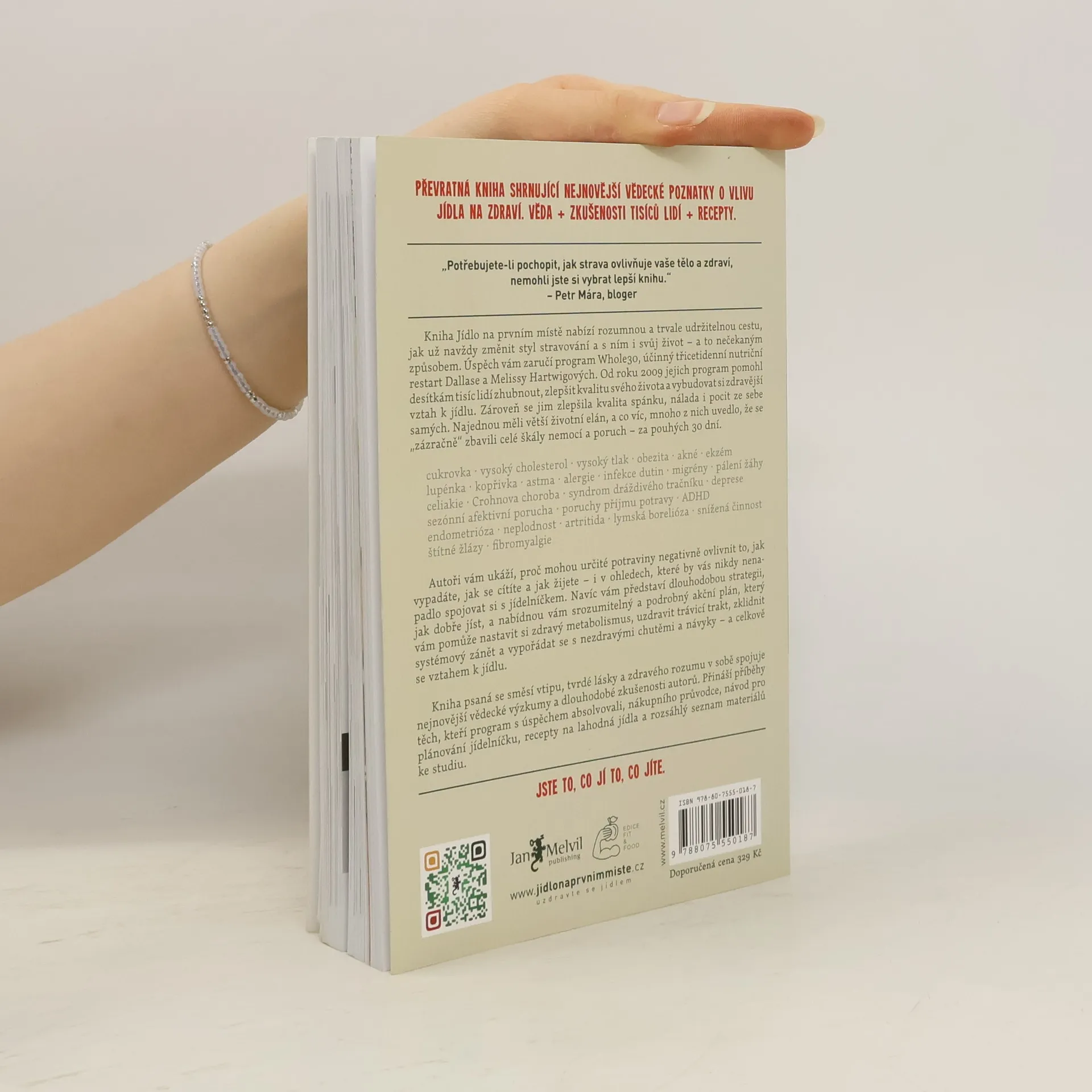 Jídlo na prvním místě není řadová kniha o paleodietě, tohle je Melvilem pečlivě zvolený vstupní titul nabízející skutečnou životní změnu. Že nemáte tušení, co to je paleodieta? Všichni víme, že jídlo ovlivňuje kvalitu našeho života – ale jak velkou moc vlastně má? Melissa a Dallas vás přesvědčí, že mimořádnou! Jídlo na prvním místě je přehledný, čtivý a srozumitelný návod, díky kterému konečně pochopíte vzájemné reakce inzulínu, leptinu, kortizolu a glukagonu. Autoři vám na podkladě vědeckých výzkumů vysvětlí fakt, proč sacharidy v naší stravě nejsou tím nejpříznivějším palivem a že paleodieta je nejlepší způsob, jak je nahradit. Autoři tvrdí, že už během 30 dnů po změně stravovacího plánu sestaveného podle jejich instrukcí dochází ke zlepšení stavu mnoha chronických, obtížně léčitelných onemocnění, jako jsou cukrovka, lupénka, Crohnova choroba, endometriáza, ekzémy a dalších. Množství receptů a tipů je doplněno vysvětlením, co jak na jednotlivá jídla reaguje naše tělo. Sympatičtí autoři vás postupně a s humorem převedou k zdravým návykům, díky nimž dochází ke zlepšení stavu celého těla, hormonální rovnováze, ústupu zažívacích obtíží a redukci zánětlivých procesů. Hartwigovi jsou tvrďáci. 30 dní jejich kůry je velmi náročný měsíc, ale jak sami říkají, je to pro vaše dobro: "Neodvažujte se namítat, že je to těžké. Skoncovat s heroinem je těžké. Porazit rakovinu je těžké. Pít kávu bez mléka NENÍ TĚŽKÉ!" 2. aktualizované vydání