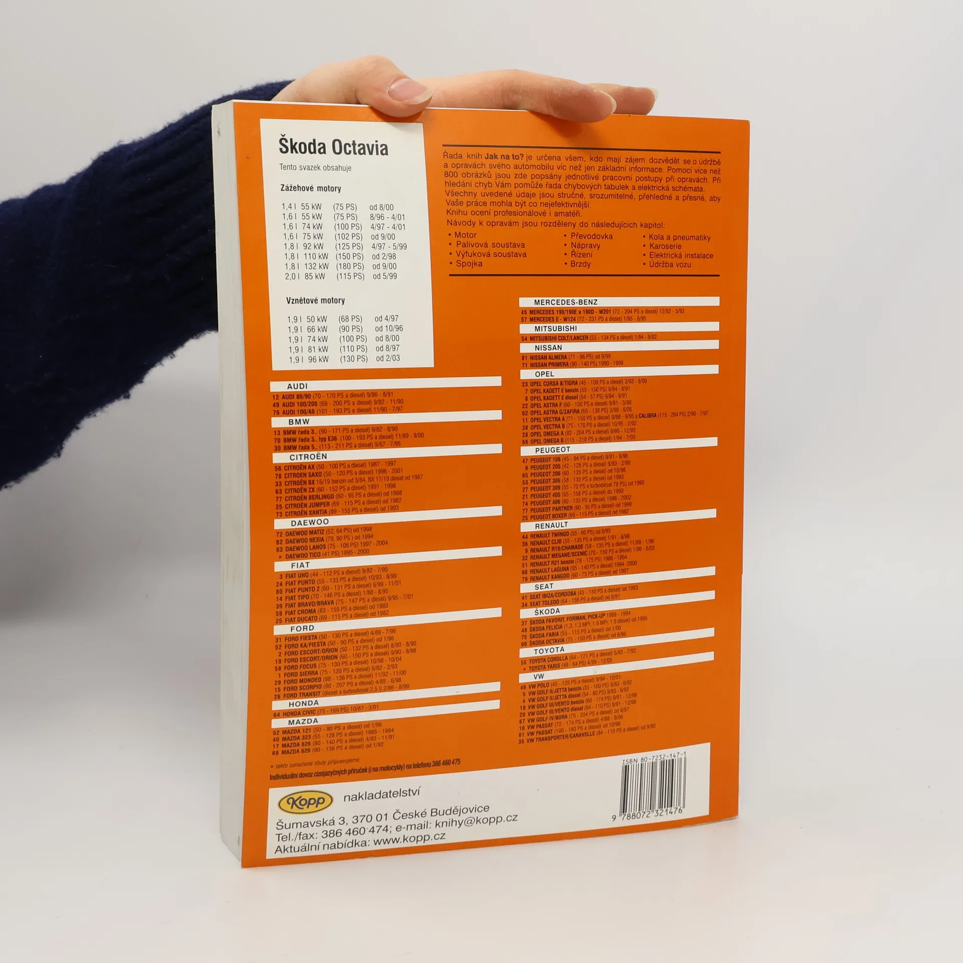 Kniha patří do řady automobilových příruček nazvané "Jak na to?". Příručka popisuje údržbu a opravy automobilů Škoda Octavia a je vhodná pro profesionály i amatéry. Publikace obsahuje přibližně 800 obrázků, 50 tabulek a elektrických schémat. Kniha popisuje tyto vozy ŠKODA OCTAVIA: Zážehové motory # 1,4 l 55 kW (75 PS) AXP/BCA 08/00- # 1,6 l 55 kW (75 PS) AEE 08/96-04/01 # 1,6 l 74 kW (100 PS) AEH/AKL 04/97-04/01 # 1,6 l 75 kW (102 PS) AVU/BFQ 09/00- # 1,8 l 92 kW (125 PS) AGN 04/97-05/99 # 1,8 l 110 KW (150 PS) AGU/ARZ/AUM/ARX (Turbo) 02/98- # 1,8 l 132 kW (180 PS) AUQ (Turbo) 12/00-12/05 # 2,0 l 85 kW (115 PS) AEG/AQY/APK/AZH/AZJ 05/99-12/05 Vznětové motory # 1,9 l 50 kW (68 PS) AQM (SDI) 4/97-11/03 # 1,9 l 66 kW (90 PS) AGR/ALH (TDI) 10/96-10/04 # 1,9 l 81 kW (110 PS) AHF/ASV (TDI) 08/97-12/05 # 1,9 l 96 kW (130 PS) ASZ (TDI-PD)12/02-10/04