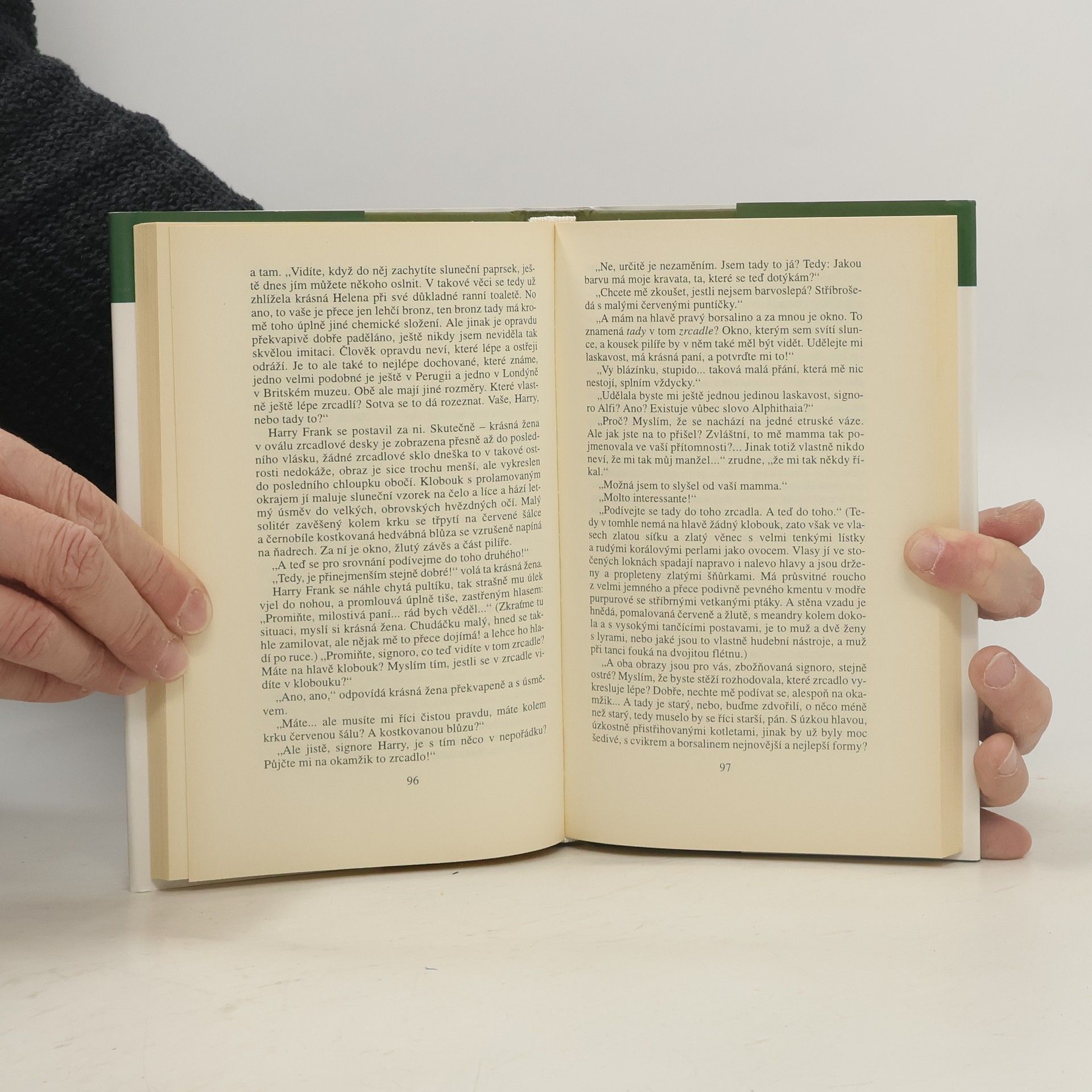 Vzájemně se prolínající příběhy, jejichž hrdinové prožívají své osudy v různých časových rovinách, čtenář jako by sledoval přes poloprůsvitný závoj. Do Říma, prodchnutého atmosférou Mussoliniho vlády, přijíždí stárnoucí židovský emigrant Harry Frank. U stánku s lacinými suvenýry si kupuje repliku etruského zrcadla a od té chvíle se stává součástí pradavného národa, ztotožňuje se s osudem antických hrdinů...