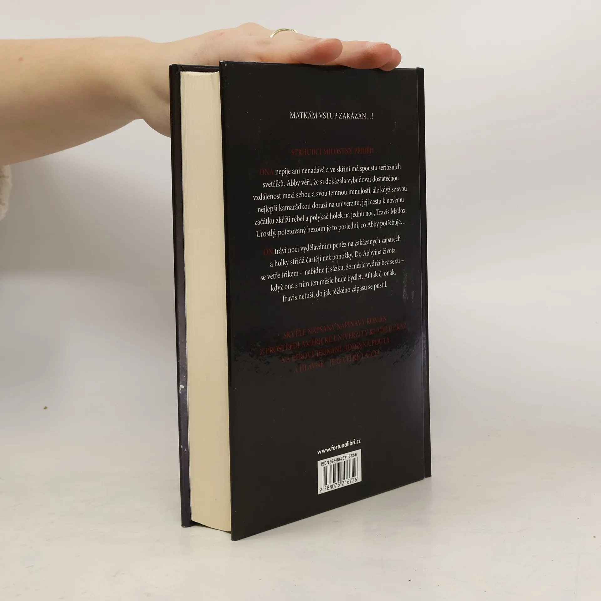 Ona nepije ani nenadává a ve skříni má spoustu seriózních svetříků. Abby věří, že si dokázala vybudovat dostatečnou vzdálenost mezi sebou a svou temnou minulostí, ale když se svou nejlepší kamarádkou dorazí na univerzitu, její cestu k novému začátku zkříží rebel a polykač holek na jednu noc, Travis Madox. Urostlý, potetovaný hezoun je to poslední, co Abby potřebuje… On tráví noci vyděláváním peněz na zakázaných zápasech a holky střídá častěji než ponožky. Do Abbyina života se vetře trikem – nabídne jí sázku, že měsíc vydrží bez sexu – když ona s ním ten měsíc bude bydlet. Ať tak či onak, Travis netuší, do jak těžkého zápasu se pustil.
