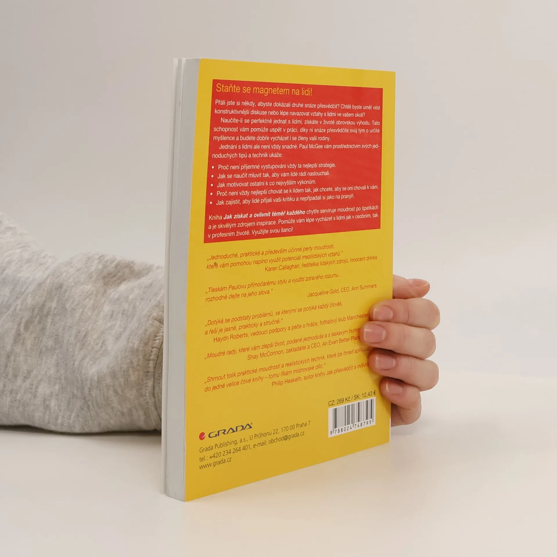 Chtěli byste umět snadněji přesvědčit jiné lidi, získat je na svou stranu a úspěšně s nimi navazovat vztahy? V této čtivé knížce plné rad a tipů se dozvíte, jak na to. Naučíte-li se perfektně jednat s lidmi, získáte v životě obrovskou výhodu. Tato schopnost vám pomůže k postupu v práci, díky ní snáze přesvědčíte druhé o určité myšlence či nápadu a budete dobře vycházet i se členy rodiny. Ale jednání s lidmi není vždy snadné. Paul McGee vám prostřednictvím svých jednoduchých tipů a technik ukáže, proč není příjemné vystupování vždy ta nejlepší strategie, jak se naučit mluvit tak, aby vám lidé rádi naslouchali, jak motivovat ostatní k co nejlepším výkonům, proč není vždy nejlepší chovat se k lidem tak, jak chcete, aby se oni chovali k vám, či jak zajistit, aby lidé přijali vaši kritiku a nepřipadali si jako na pranýři. Kniha Jak získat a ovlivnit téměř každého chytře servíruje moudrost po špetkách a je skvělým zdrojem inspirace. Pomůže vám lépe vycházet s lidmi jak v osobním, tak v profesním životě. Využijte svou šanci!